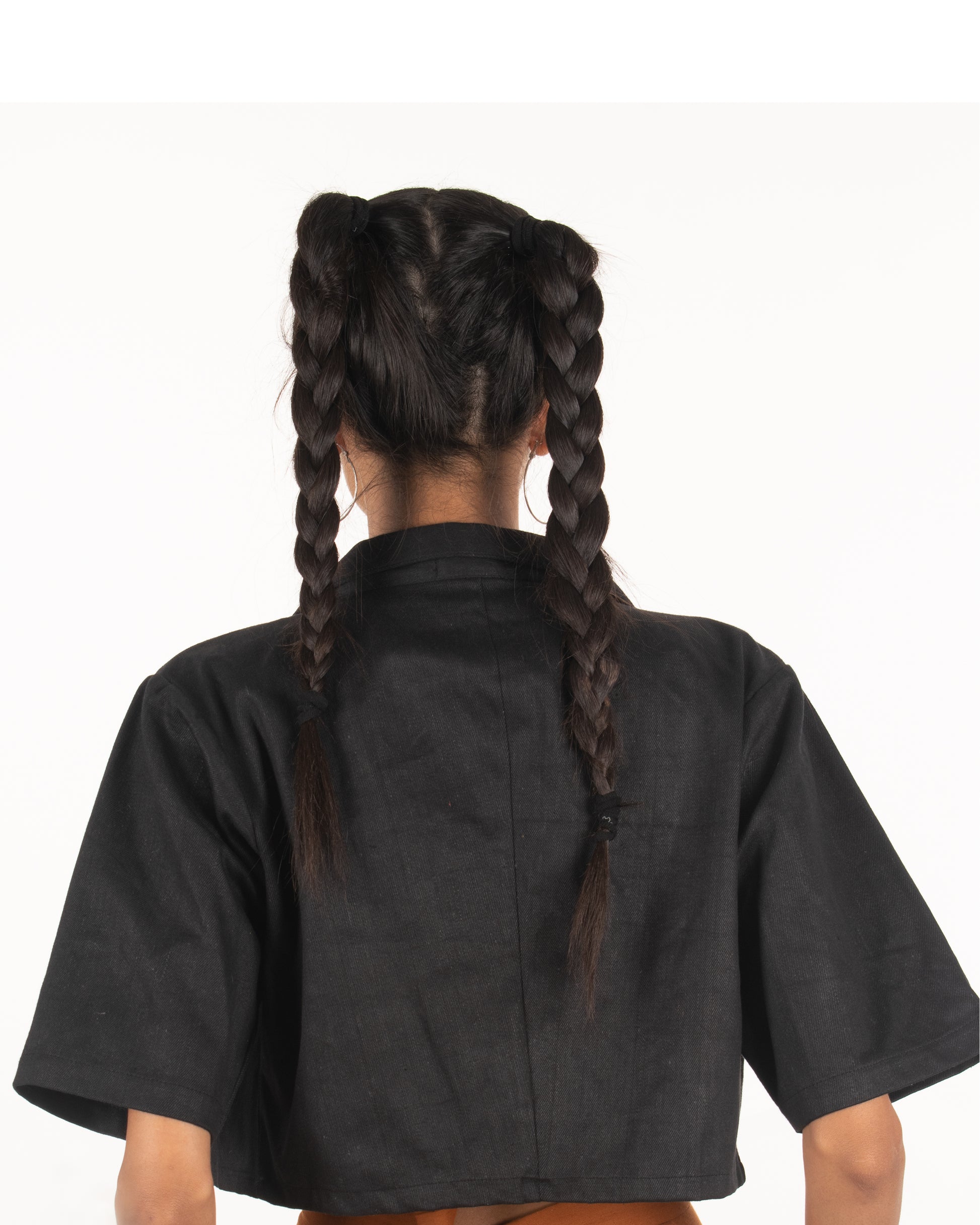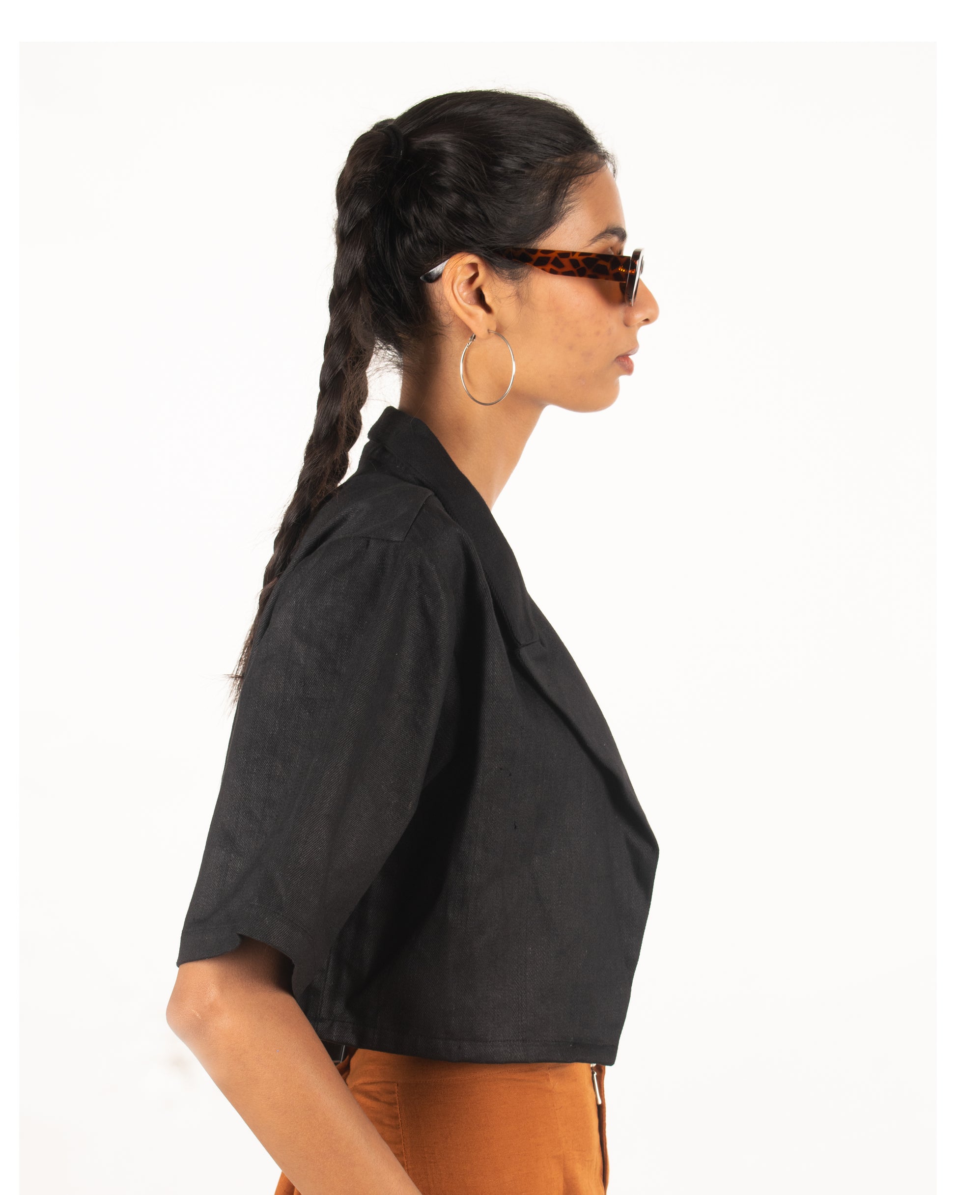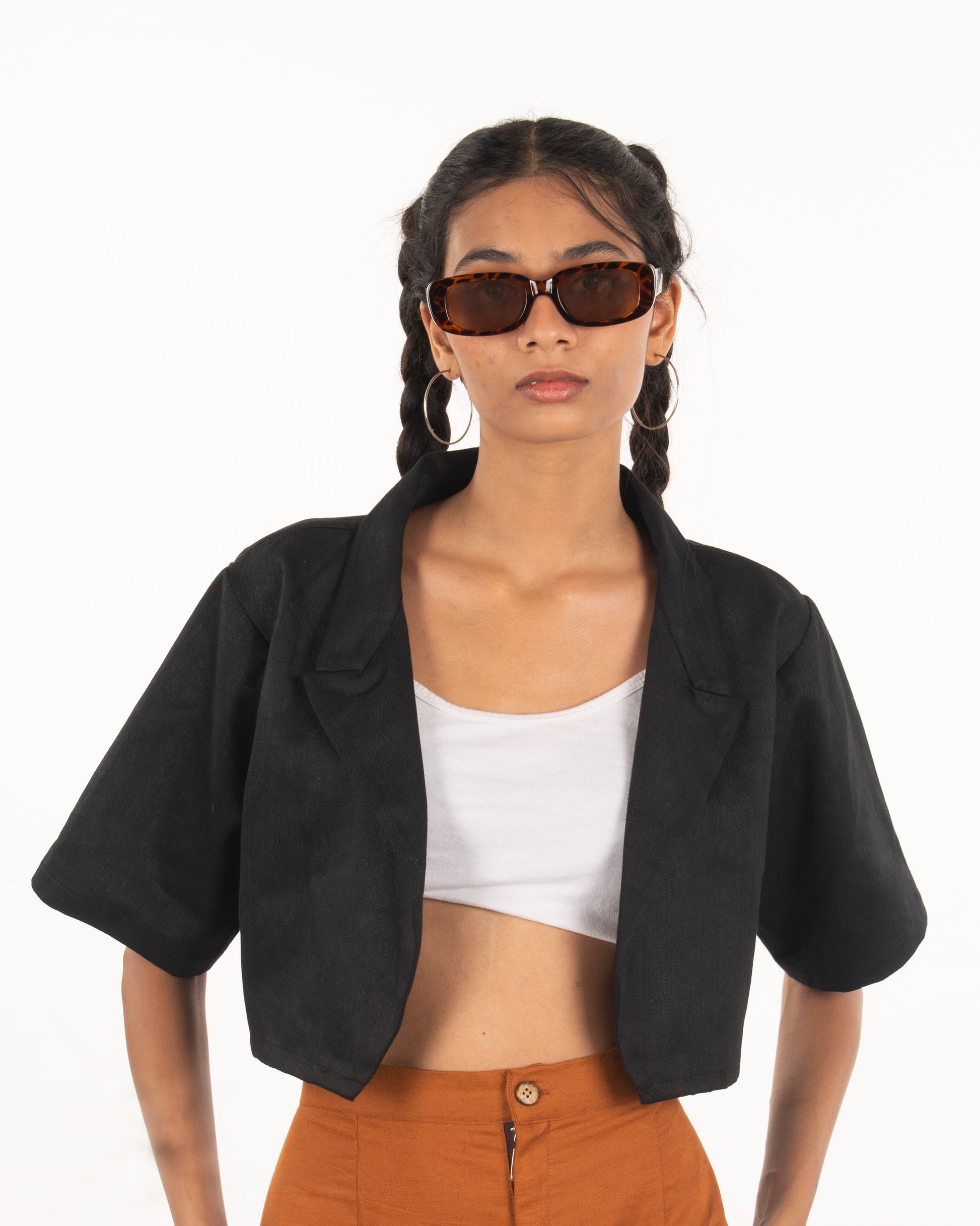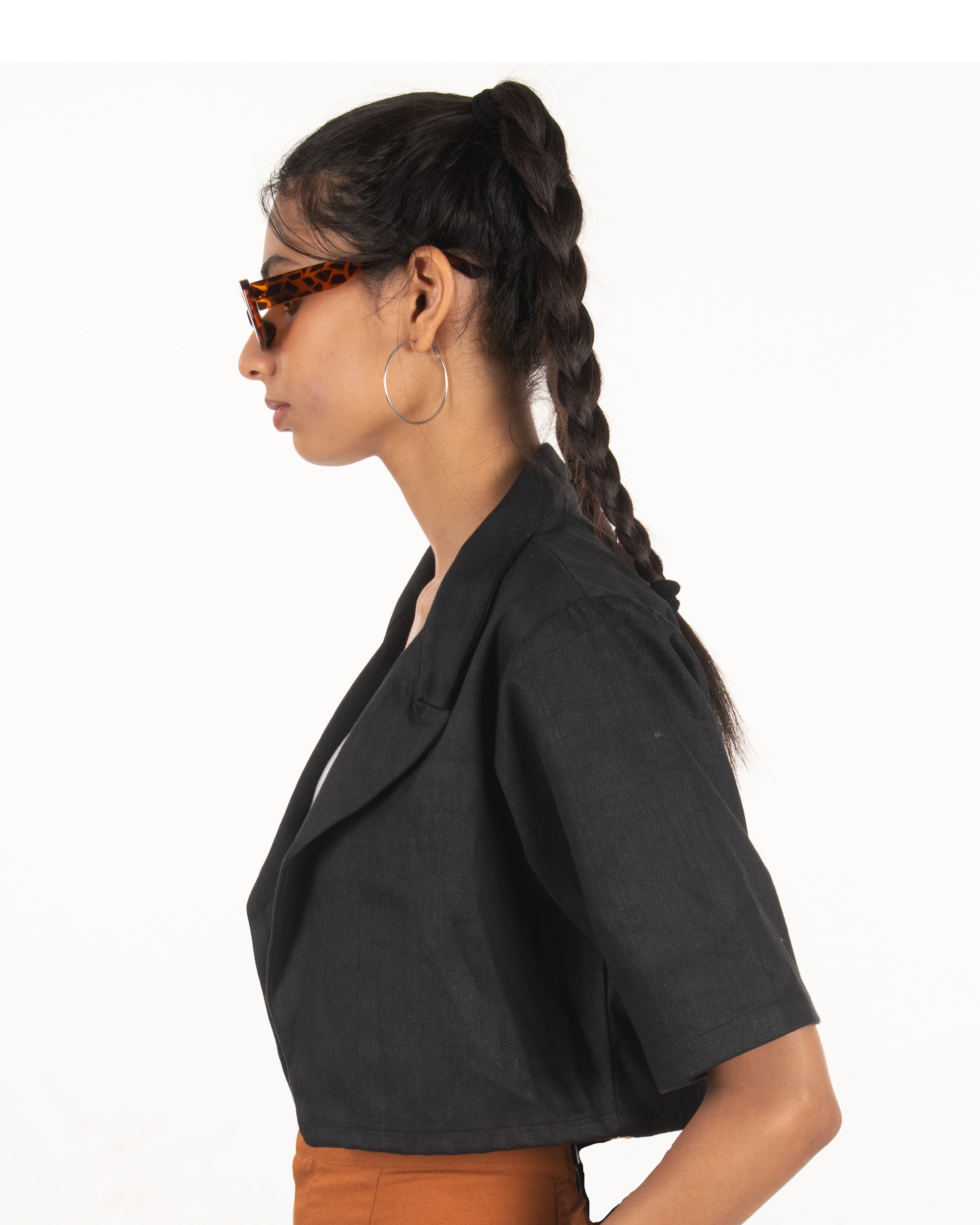 This cropped blazer is ideal for your workwear wardrobe. Layer it with a basic tee or dress and you are ready for your meetings. Featuring classic tailored notched lapels, half sleeves for oomph, and a straight hemline that hits at the natural waist. Upcycled by leftover khaadi denim cloth at Khaadi Bhandar, Gujarat.