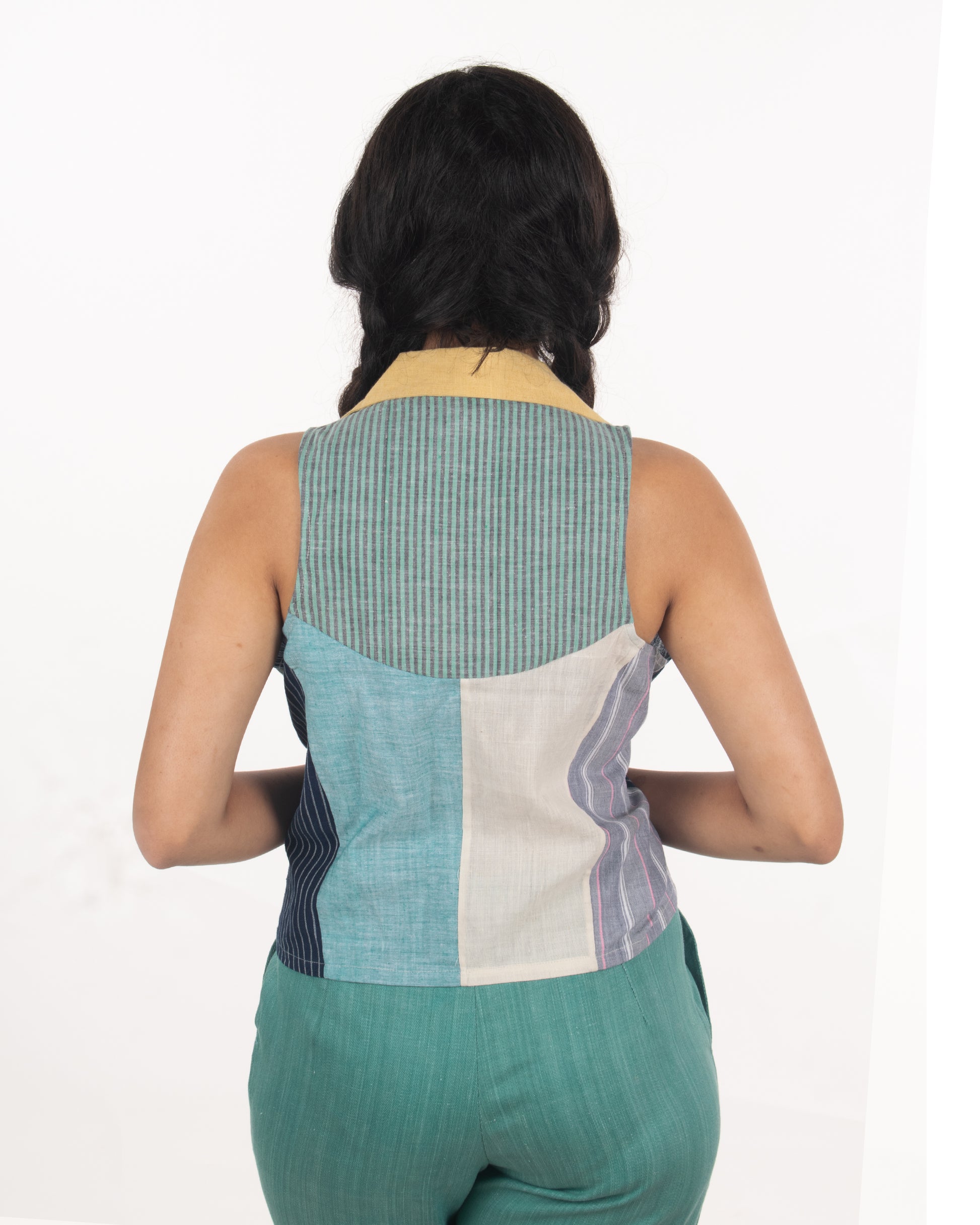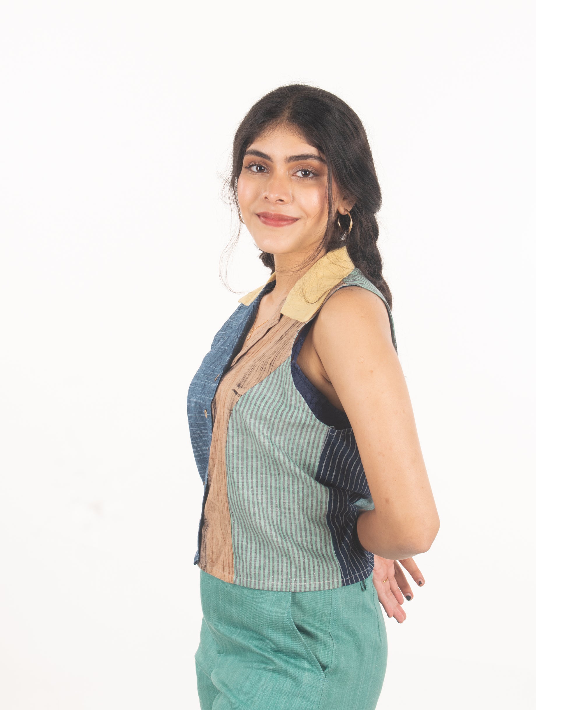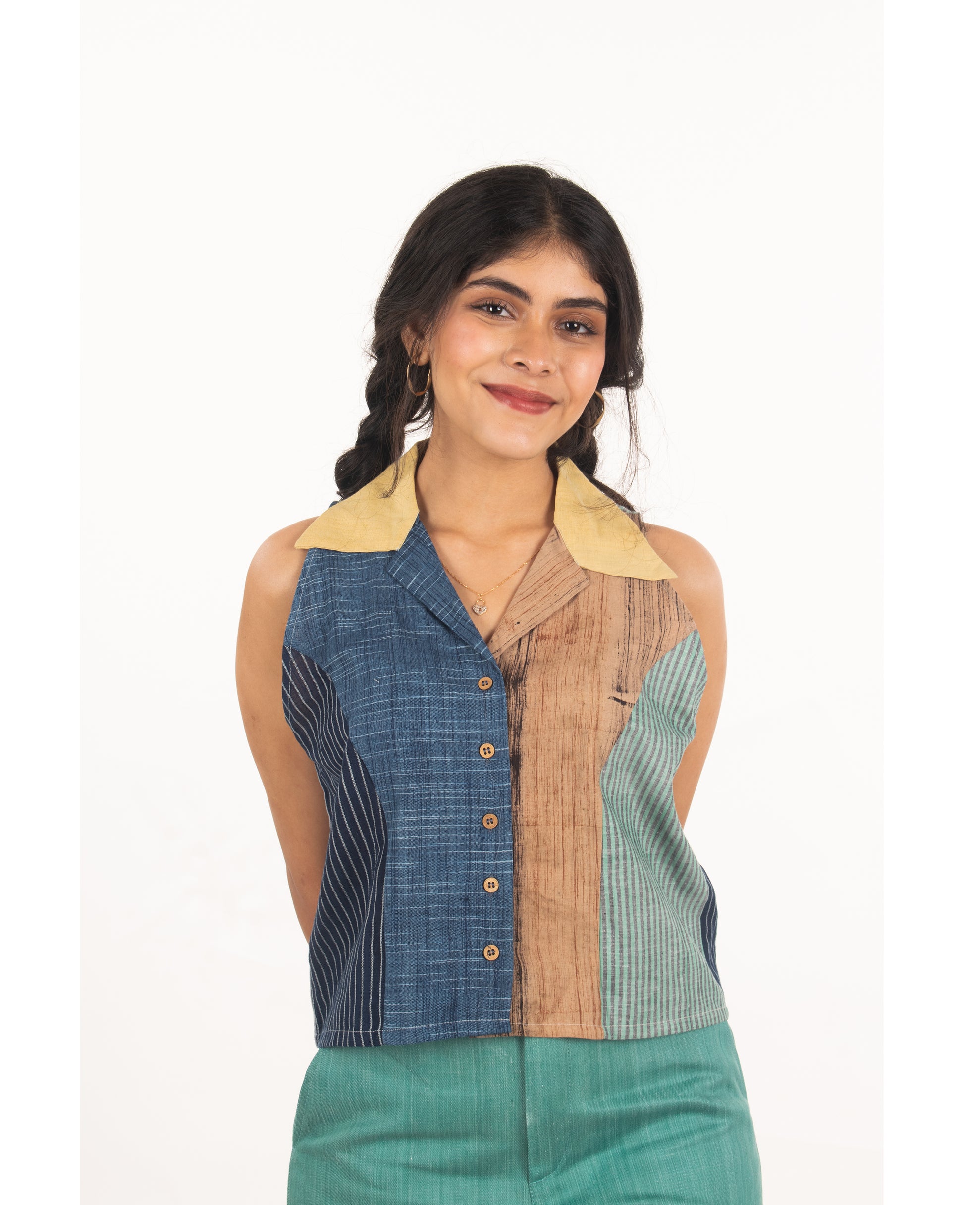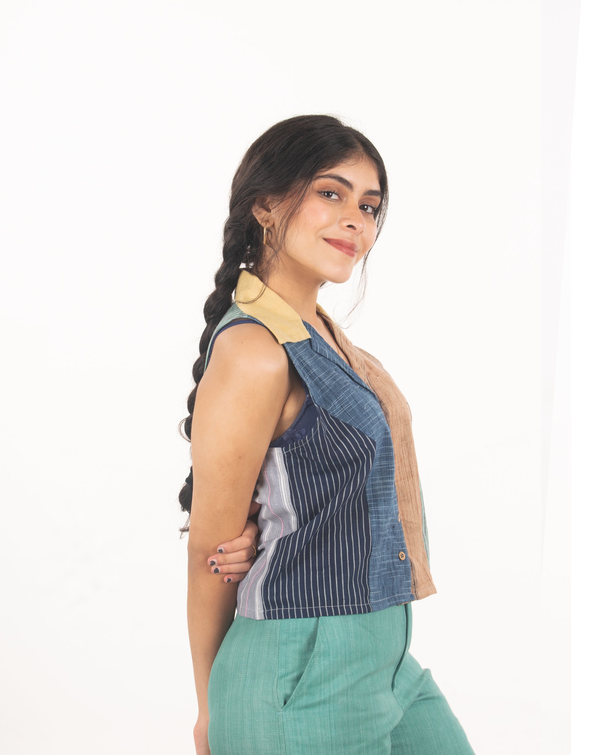 Let's go back to the 2000s with this patchwork racerback shirt. This shirt features a button-down front, and a basic collar is extremely lightweight and is a perfect addition to your summer wardrobe. Upcycled by leftover khaadi fabrics at khaadi Bhandar, Gujarat.