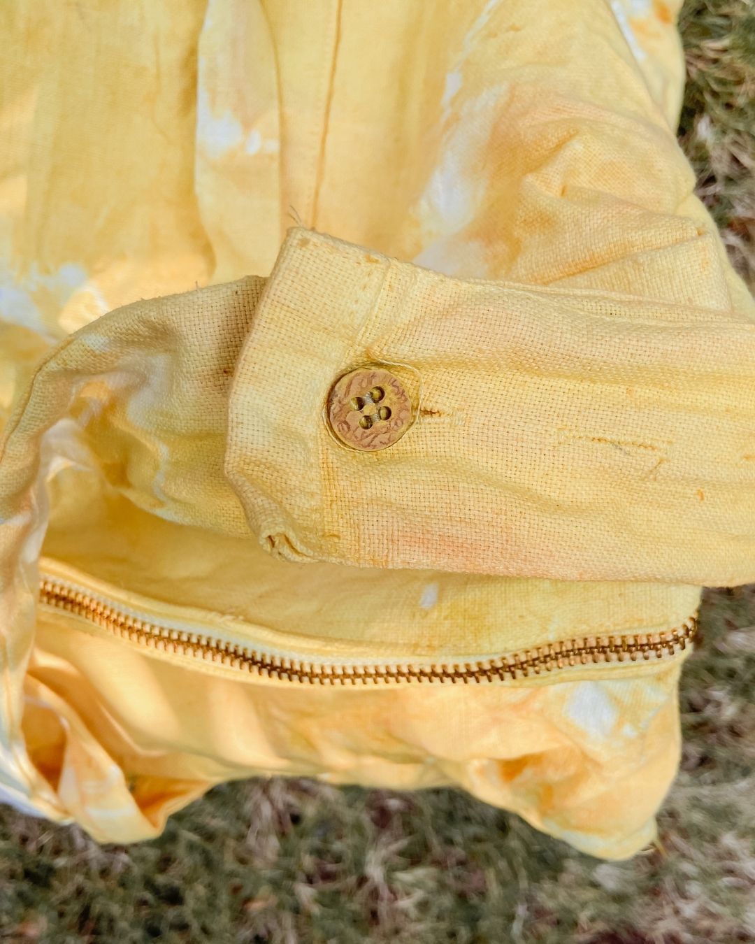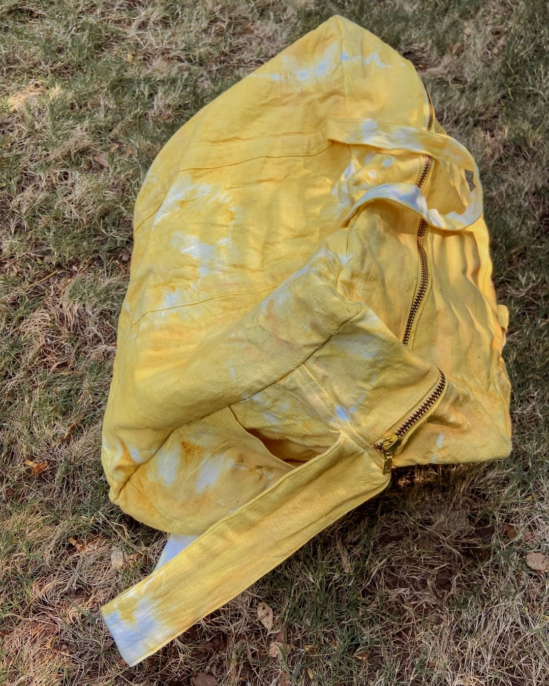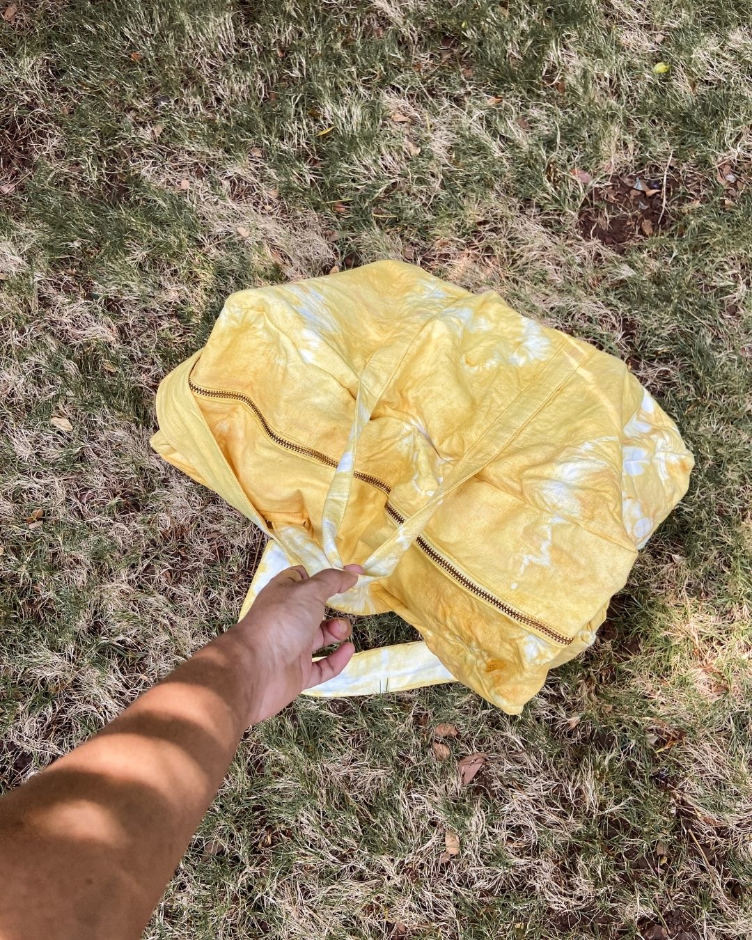 you. Get ready to pack for your next getaway consciously in our turmeric tie-dye duffel bag which has two side pockets and a metal zipper along with a handle and sling. Fabric Canvas and cotton lining, hand-wash only.
