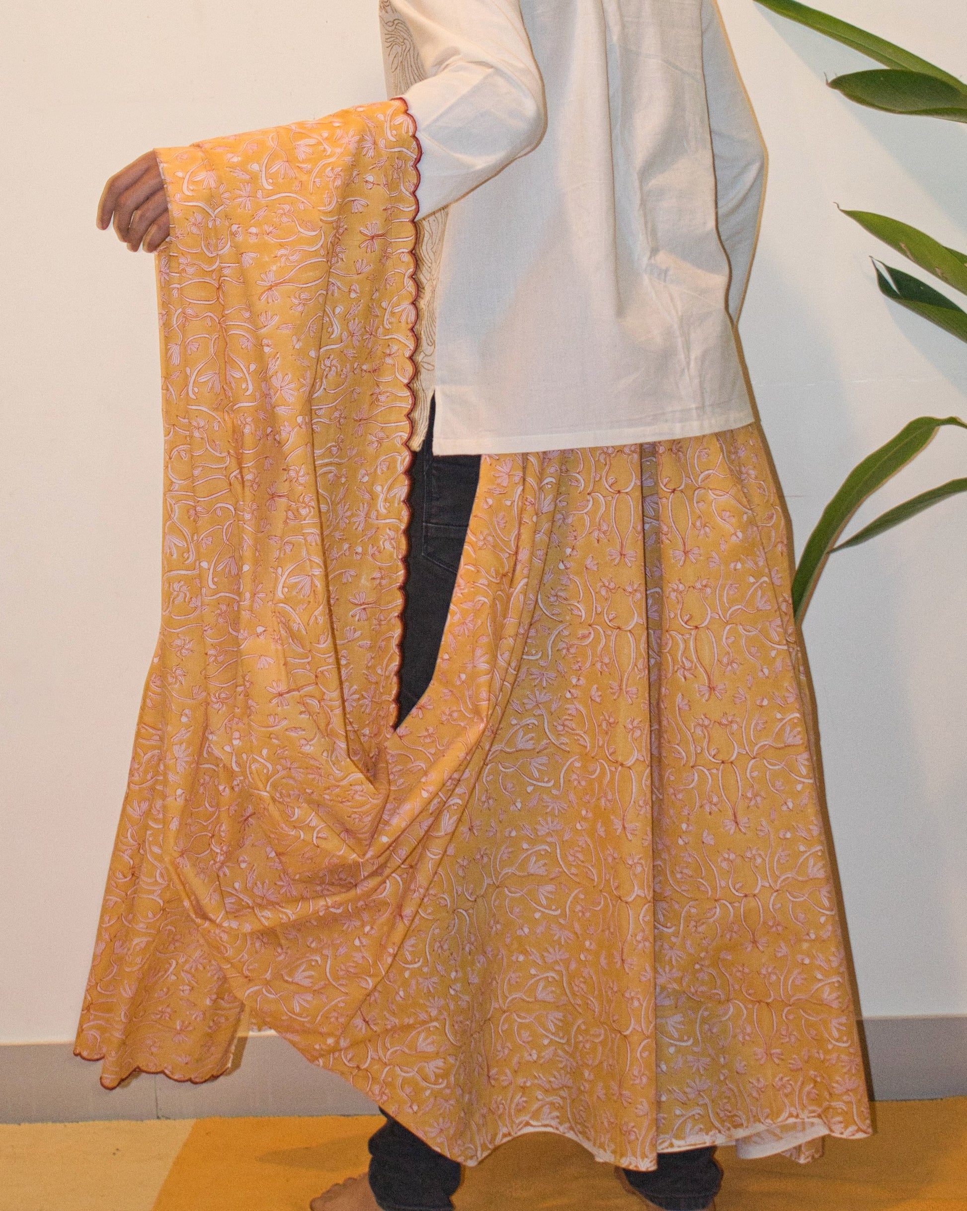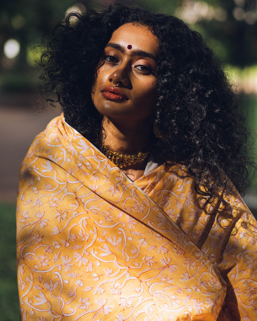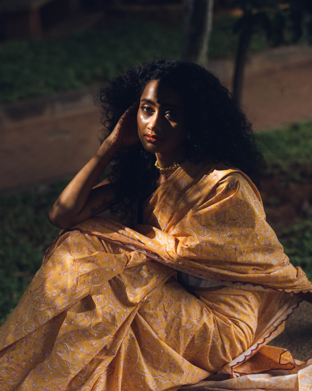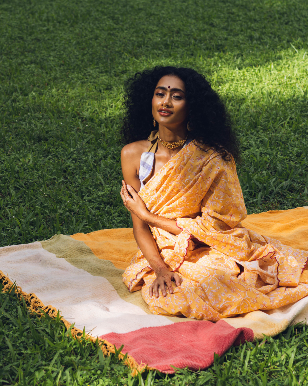 Dal khichdi is our forever comfort food and so is this sari which is going to be our go-to-look. Handcrafted from soft mul, jaal block printed from Sanganer and a striking red scalloped pallu. Feel airy, flowy, and comfy the moment you drape it as you like! Pair it with some hand-me-down jewellery to complete the festive look! TMI - This product is made from 5.5 meters of mul cotton produced in Jaipur, Block printed in Sanganer, Jaipur, produced and shot in Bangalore. We believe in being kind to the planet and supporting local artisans in all ways possible. Every purchase made at KiRu supports Indian artisans and the team working behind the scenes.