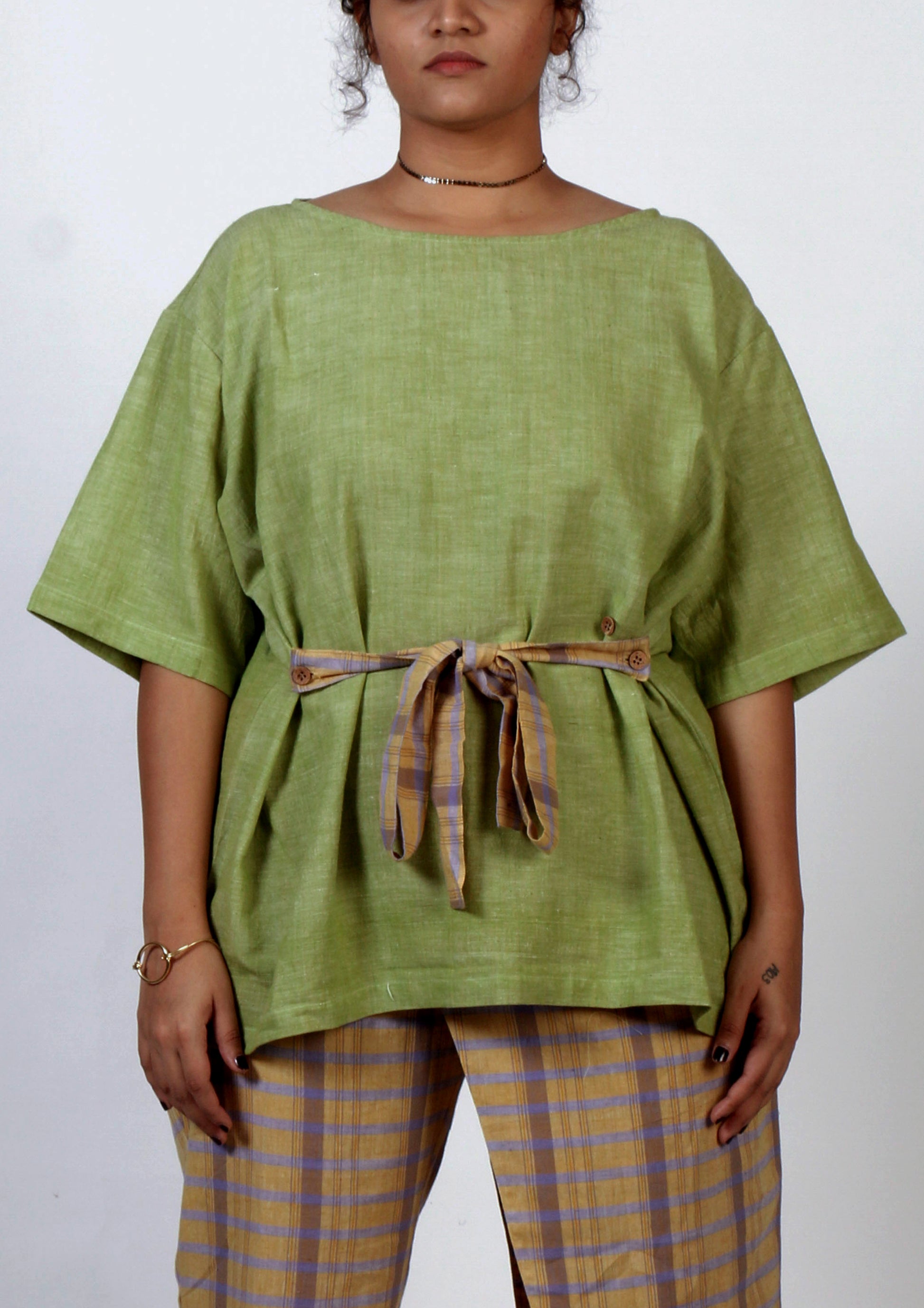 The Funk on tunic tailored from handspun chambray khaadi cloth may look like a simple oversize t-shirt on the upfront, but it has three buttons and two belts to style it how you want it to be. Attach the belts on any of the two buttons and create any silhouette you would like. The belts can be attached to each other to create a longer belt as well. Fabric: Yarn-dyed khaadi, hand-wash only.
