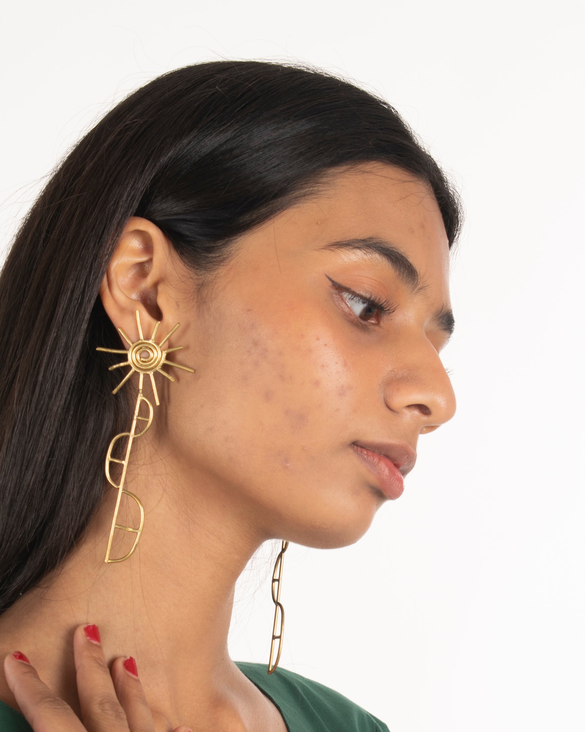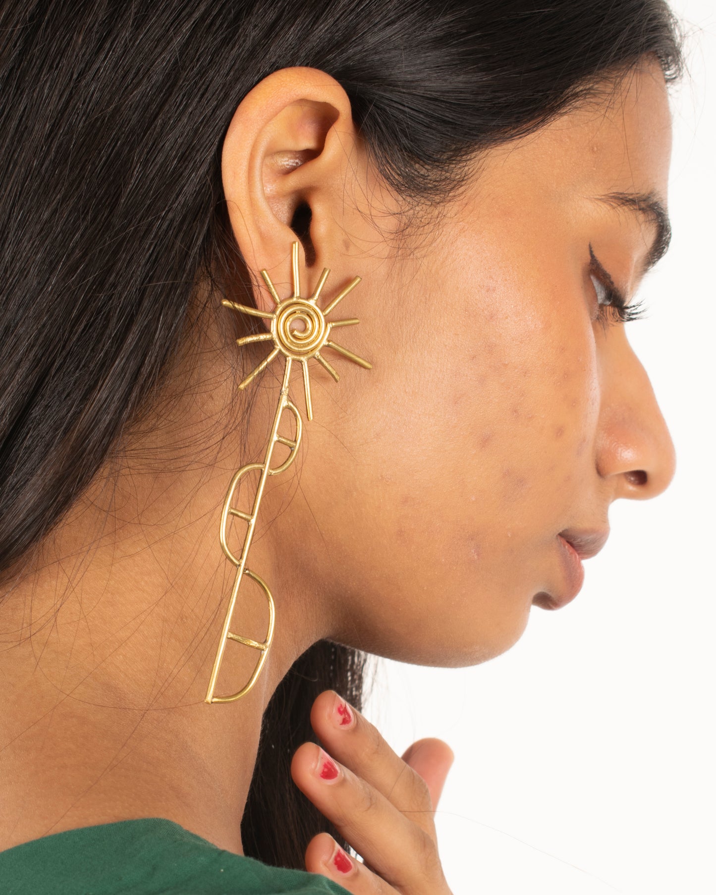 Handcrafted from recycled brass by Dhokra artisans. These statement earrings are showstopping and can make any outfit shine! These earrings are a perfect blend of traditional and contemporary elements. With their eminent length, the pair will not be overlooked, defining your style and self-expression.