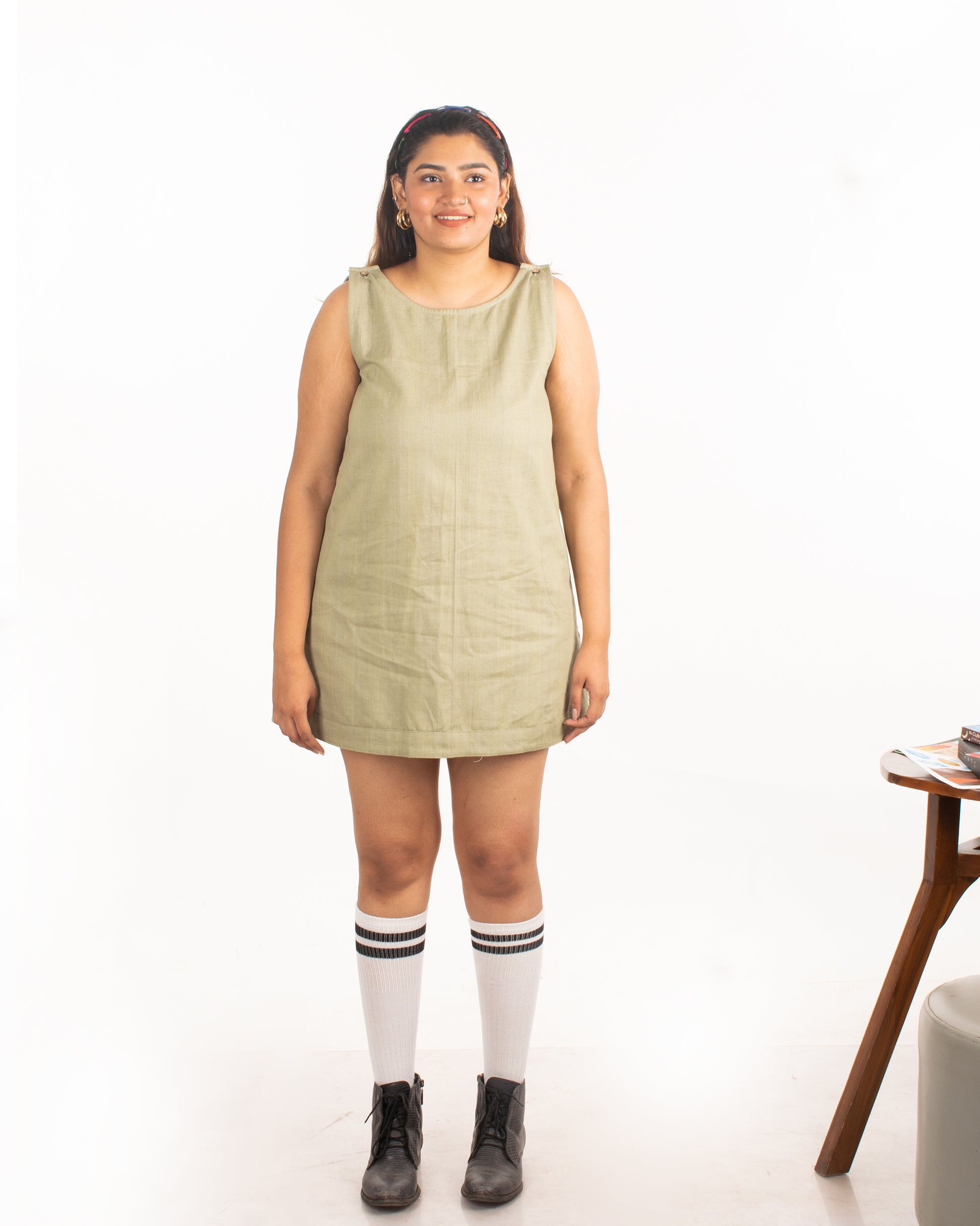 A classic versatile shift dress straight out of the mods era. Layer it like a pinafore or wear it as a dress. Handcrafted with khaadi denim, with 2 pockets and button closures at the shoulder. It is one size and fits up to size L. Upcycled by leftover khaadi denim at Khaadi Bhandar, Gujarat.