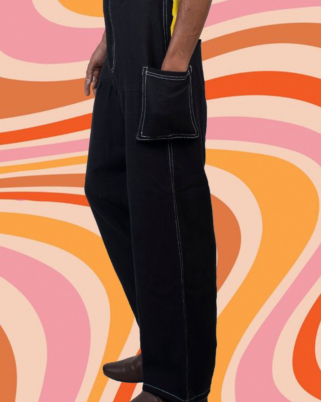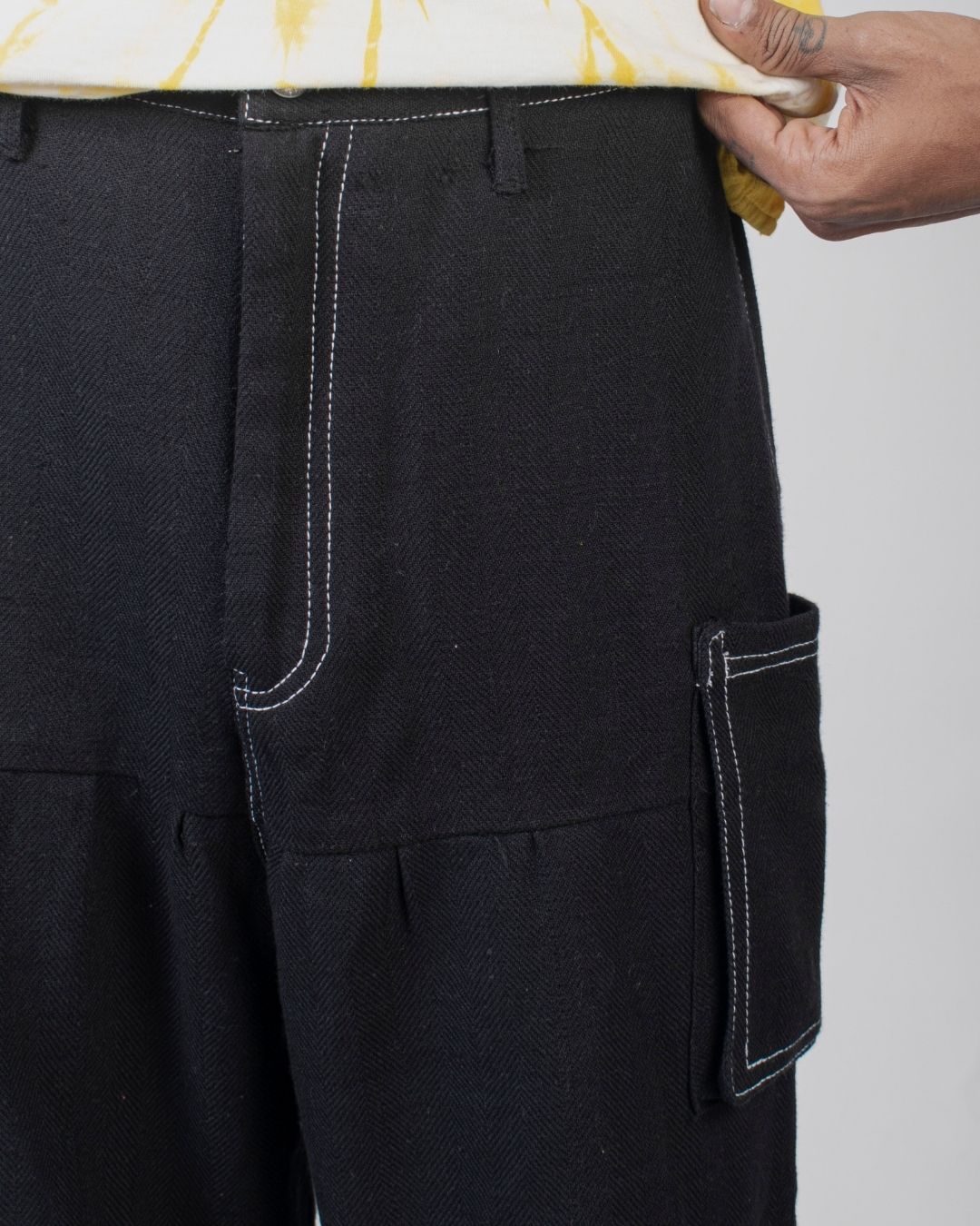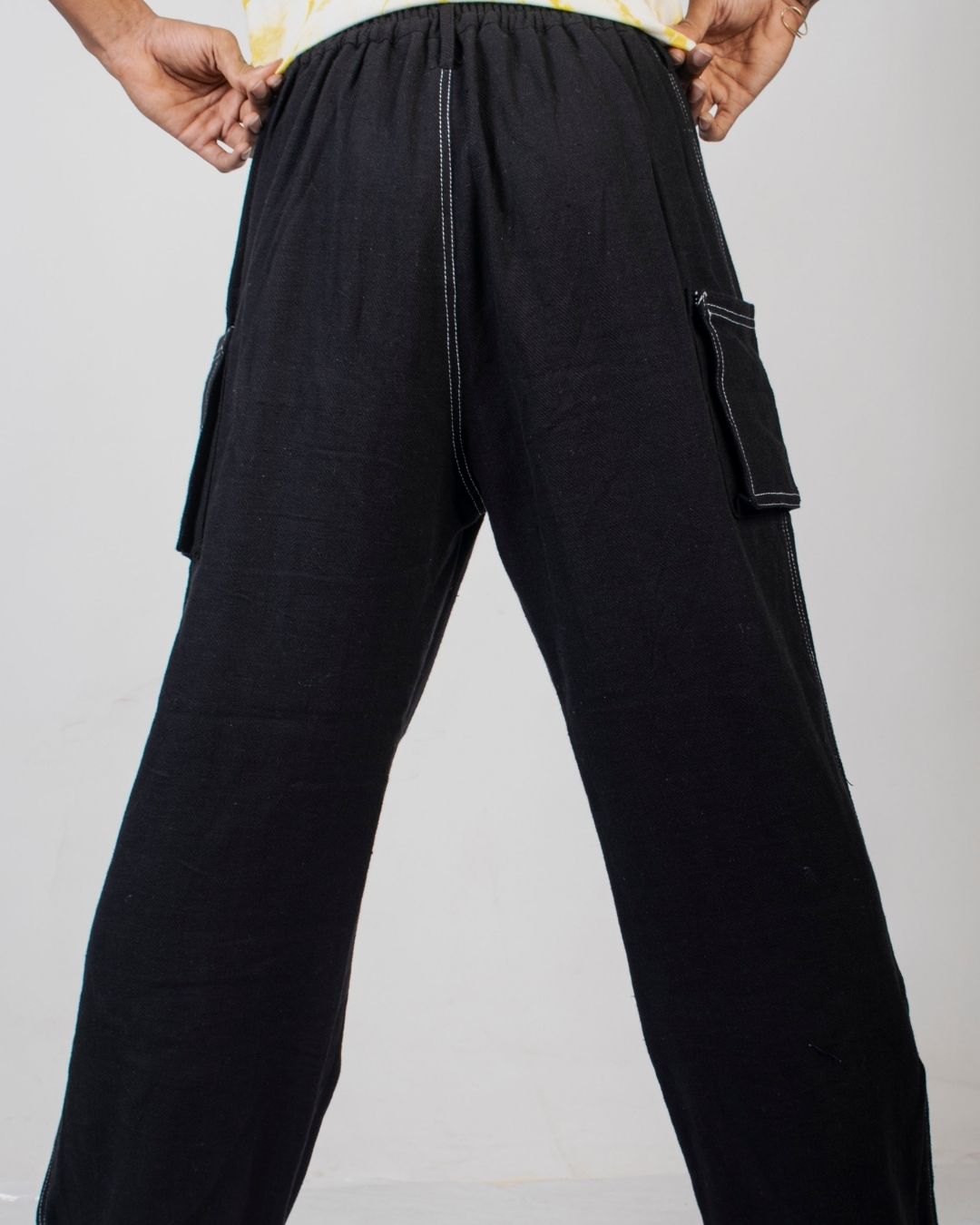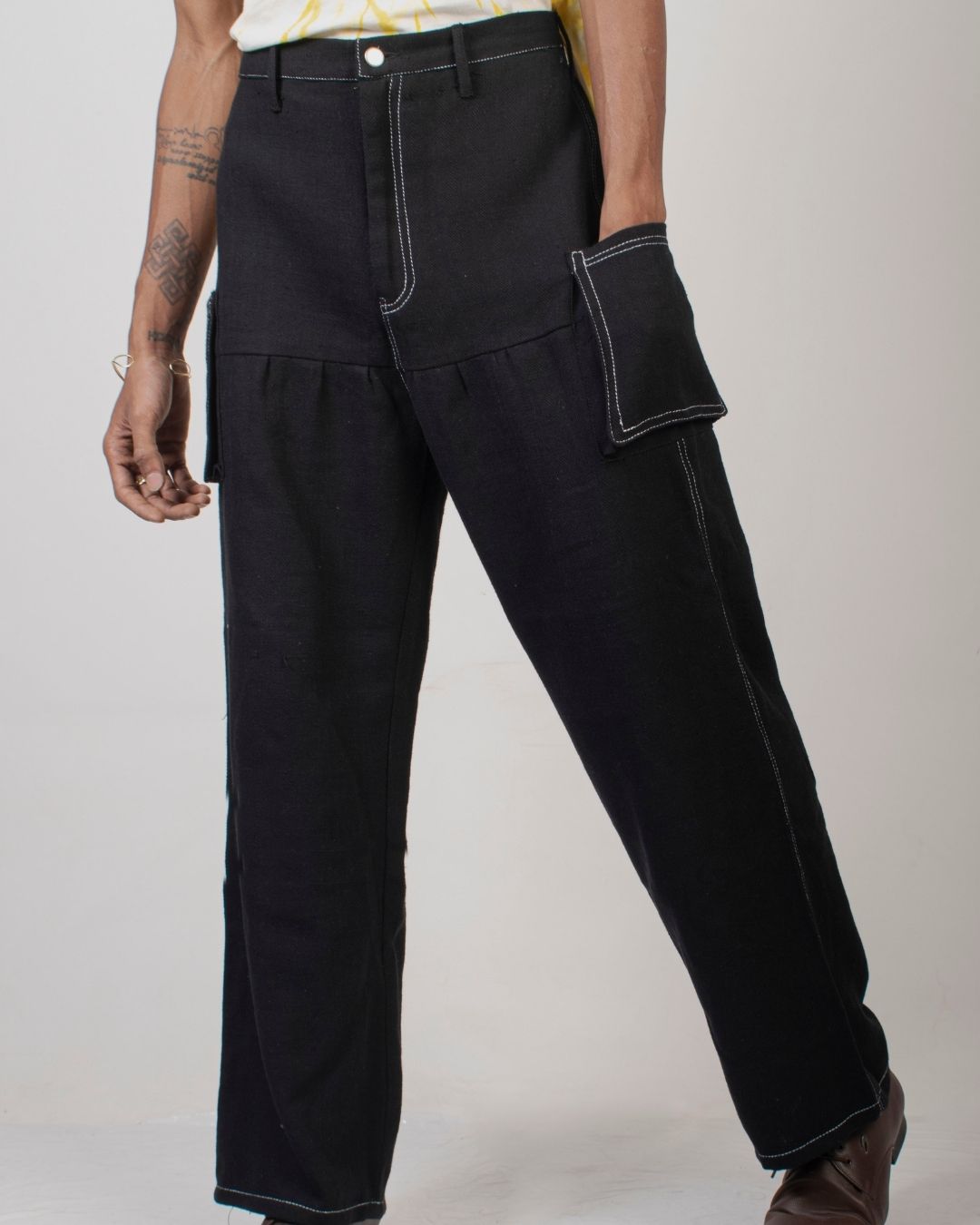 Seasonless classic black khaadi cloth trousers with gently flared hems, two patch accordion pockets on the sides with topstitch detailing, and an elasticated back for comfort. Style yours with a tucked-in curry-stained turtleneck or dress them up with a blazer.