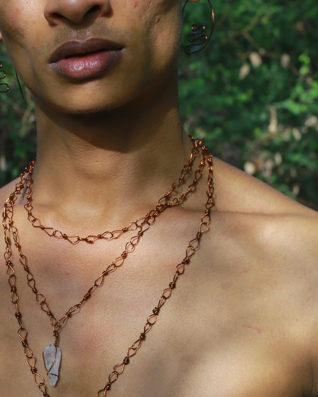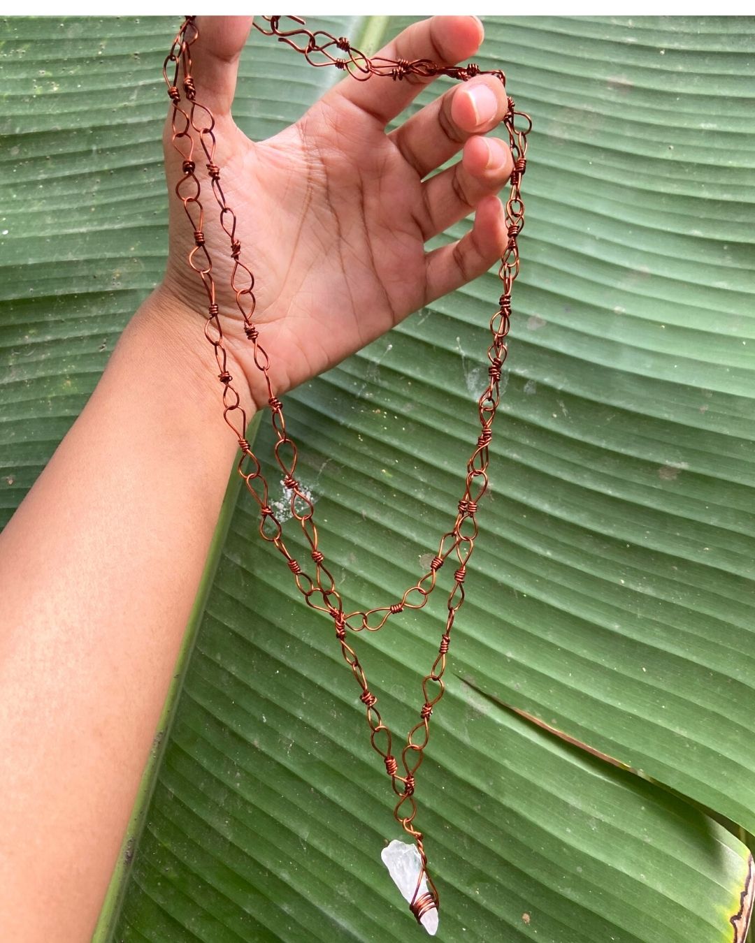 Double layered copper chain with a crystal pendant to keep all your problems away. Layer it together or wear it separately. Experience double the fun with our layered copper chain with a clear crystal pendant. Handcrafted with precision and love.