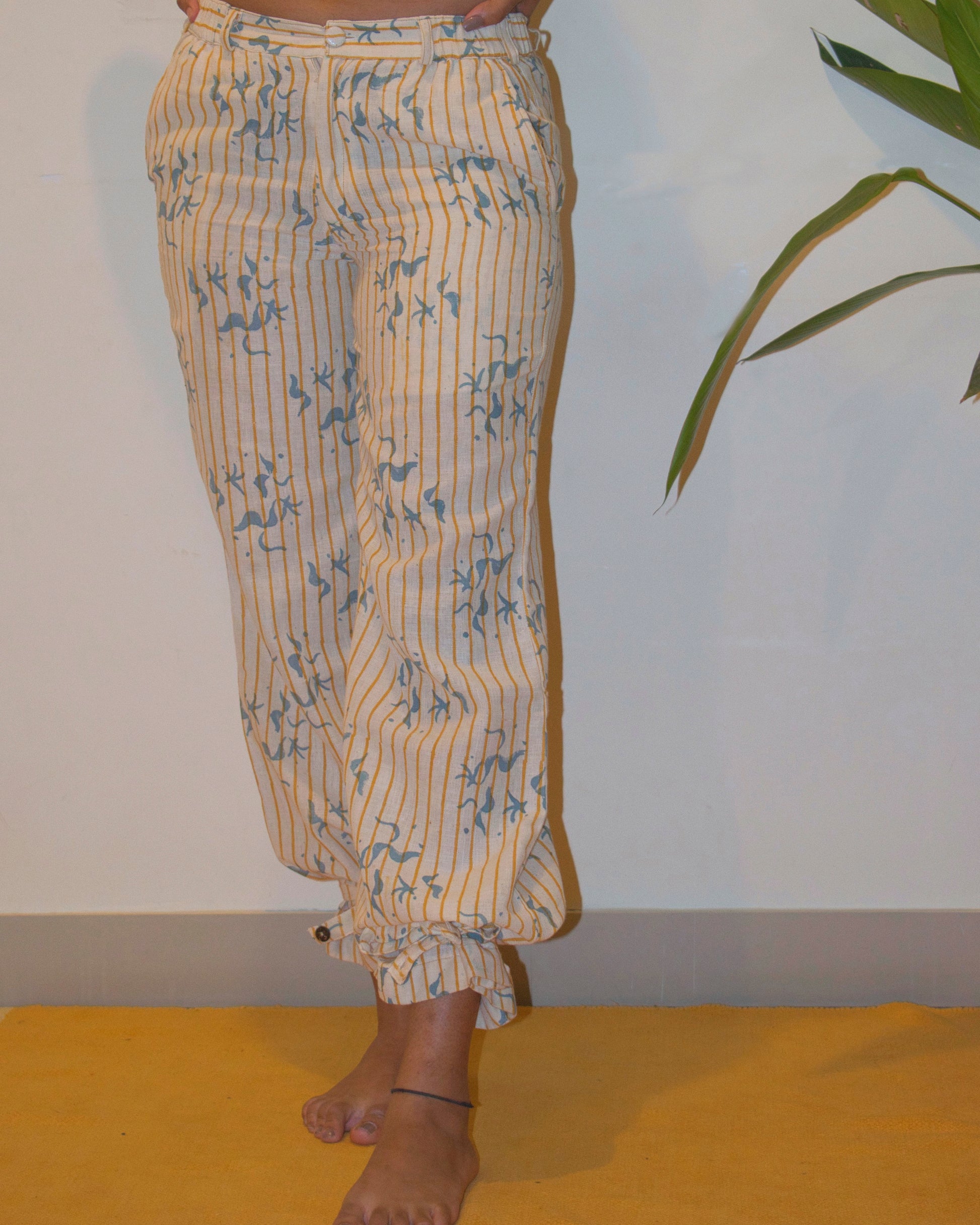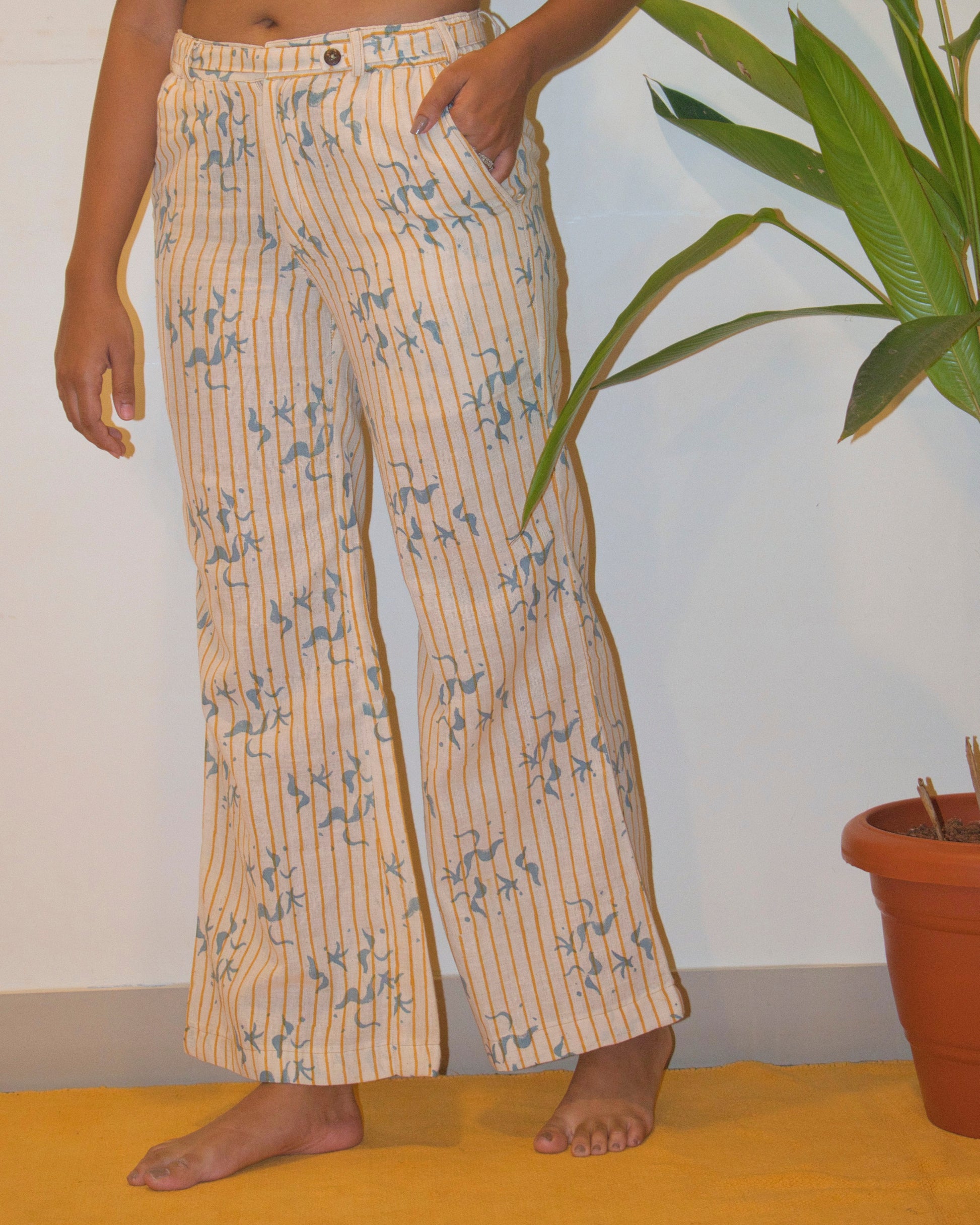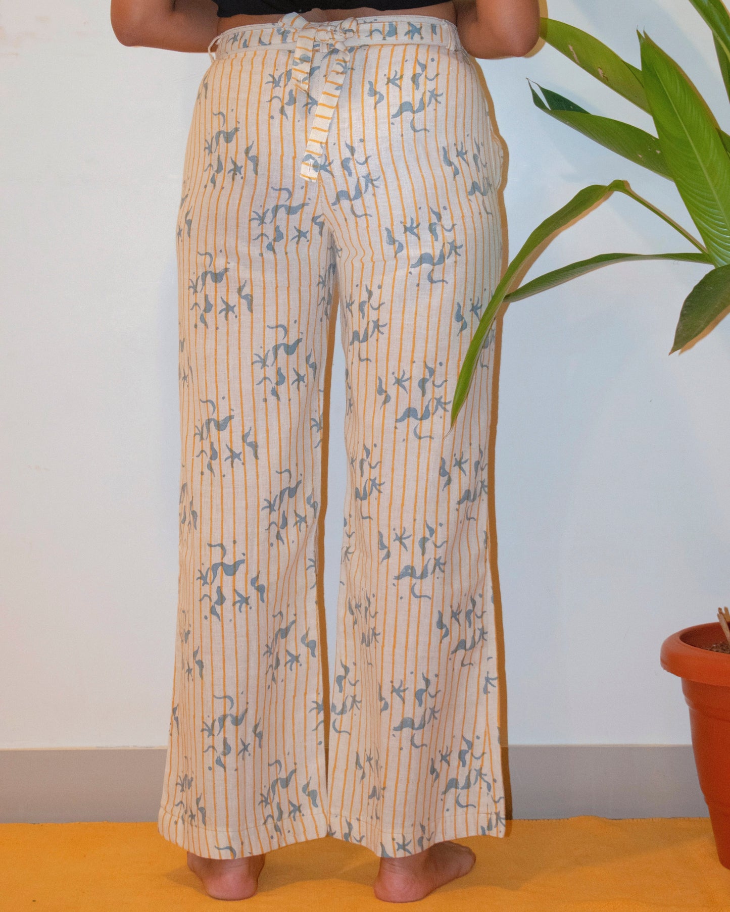 These pair of block-printed bell-bottoms are the perfect piece to own this season and with side elastic bands these trousers give you comfort to fill up the belly and look stylish. Dress it up or dress it down, whatever tickles your fancy. Handcrafted with block-printed handwoven Kala cotton, these pair of trousers have two side pockets and are elasticated at the sides. The perfect festive day to night piece to own. Fear not you can wear these with something fancy for a party or something casual for your next vacation (we're sure that's not far off ;))