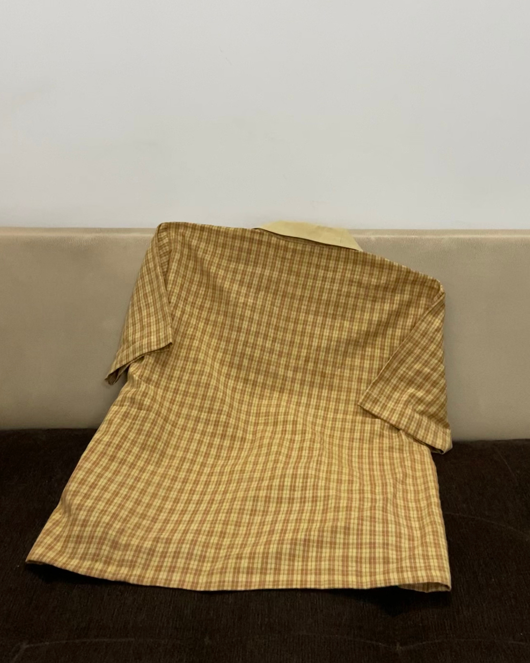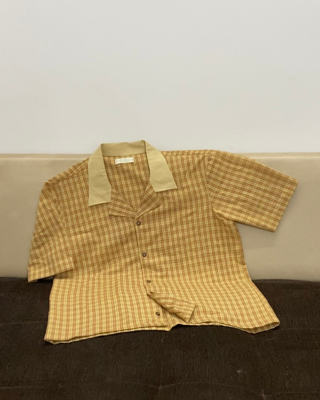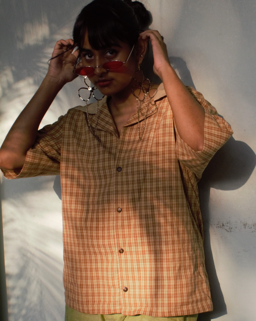 Feel like a student in our handwoven checks shirt. A simple yellow Cuban collar along with a 'clueless' checked body. Anti-fit and perfect for your business casual occasions.