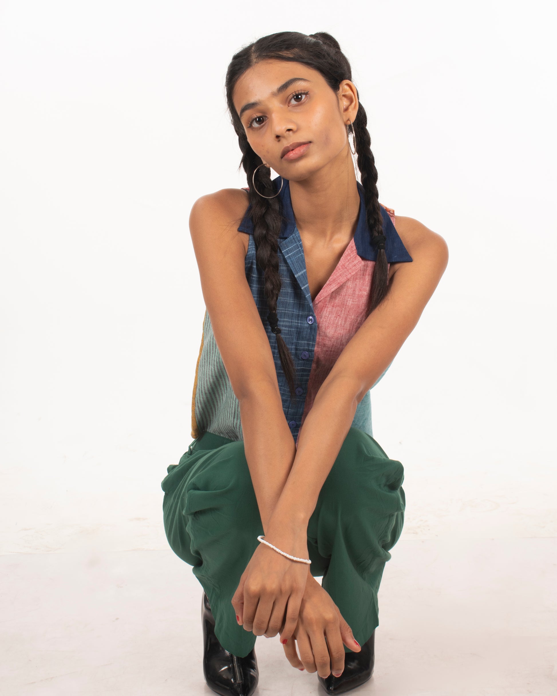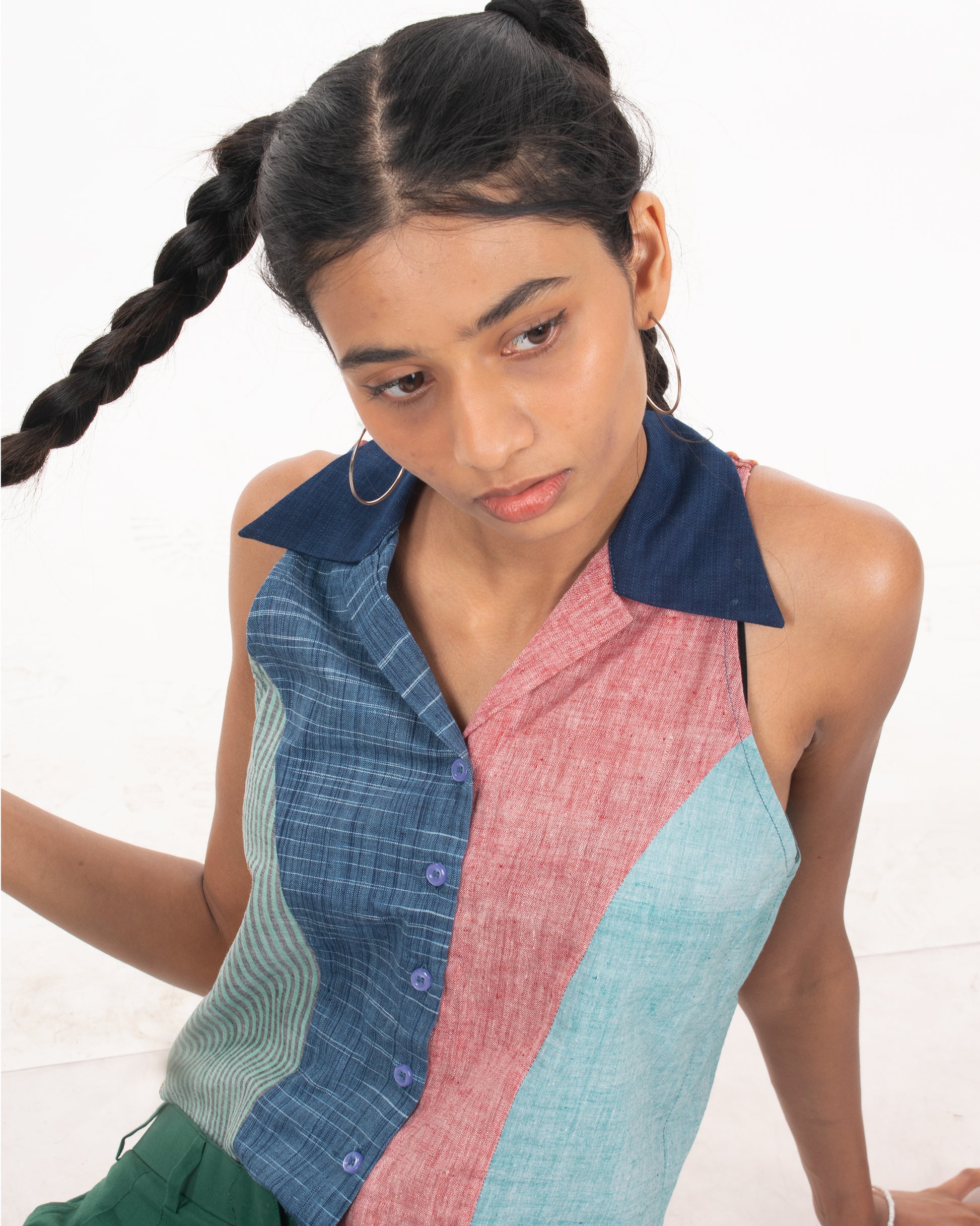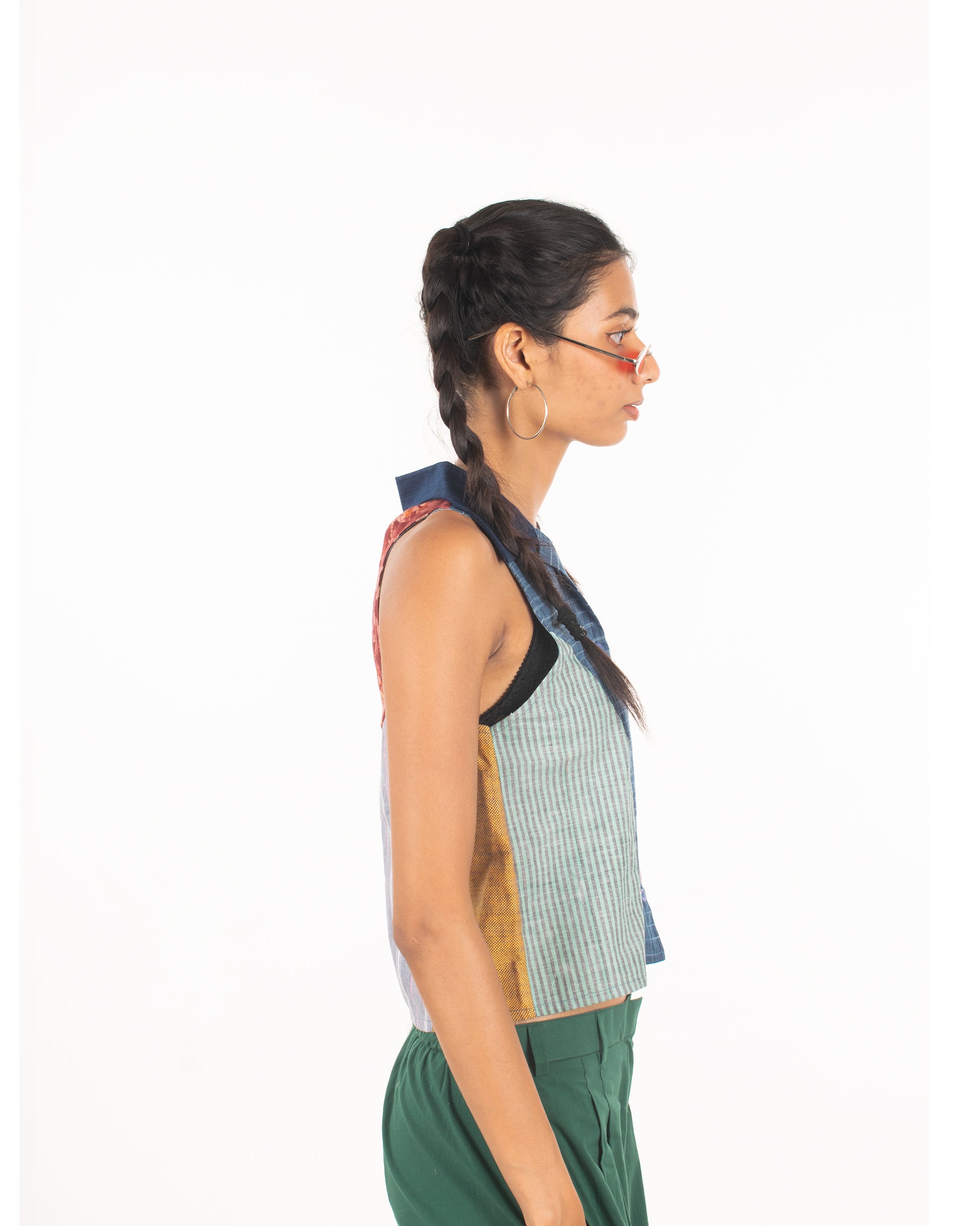 Let's go back to the 2000s with this patchwork racerback shirt. This shirt features a button-down front, and a basic collar is extremely lightweight and is a perfect addition to your summer wardrobe. Upcycled by leftover khaadi fabrics at Khaadi Bhandar, Gujarat.