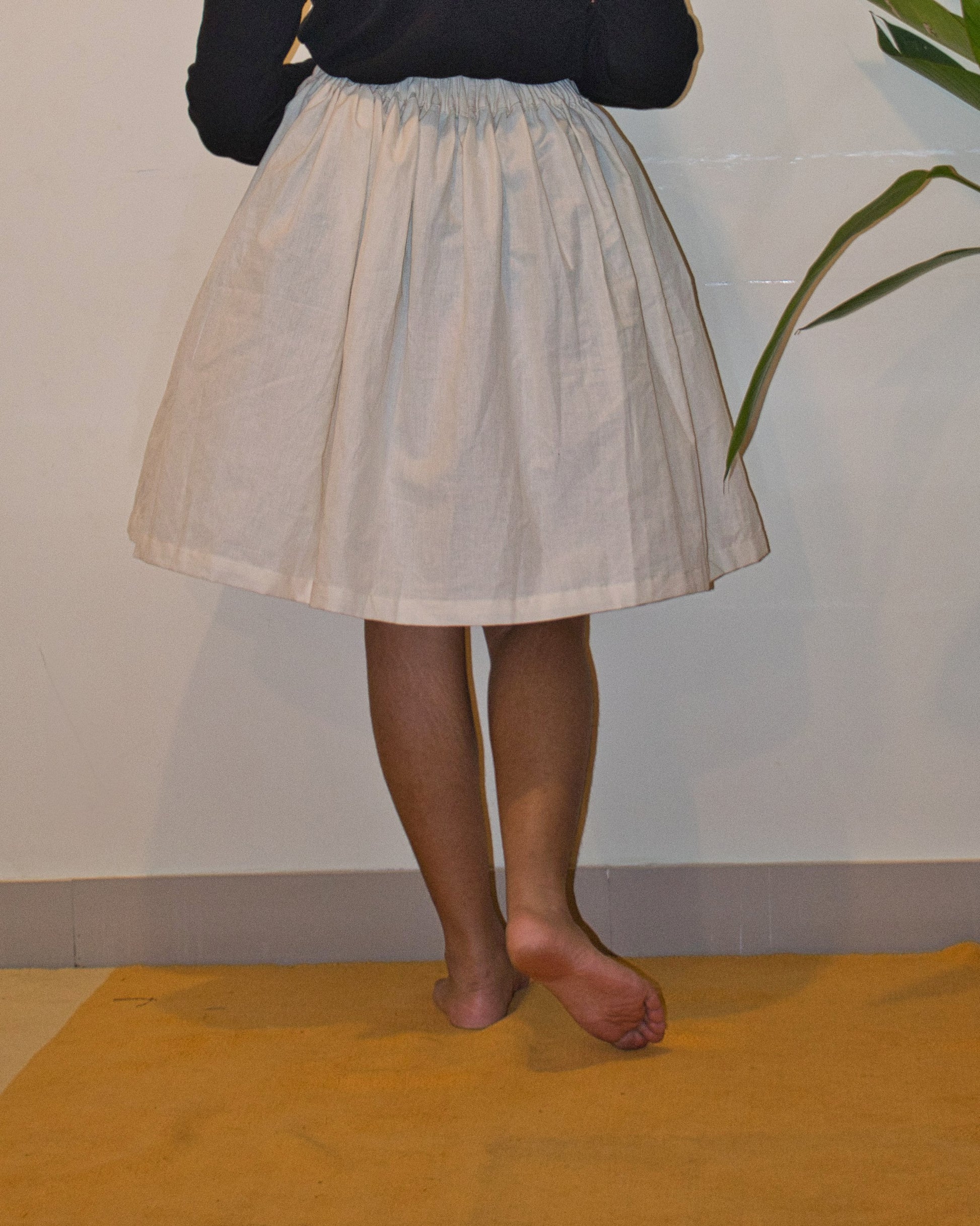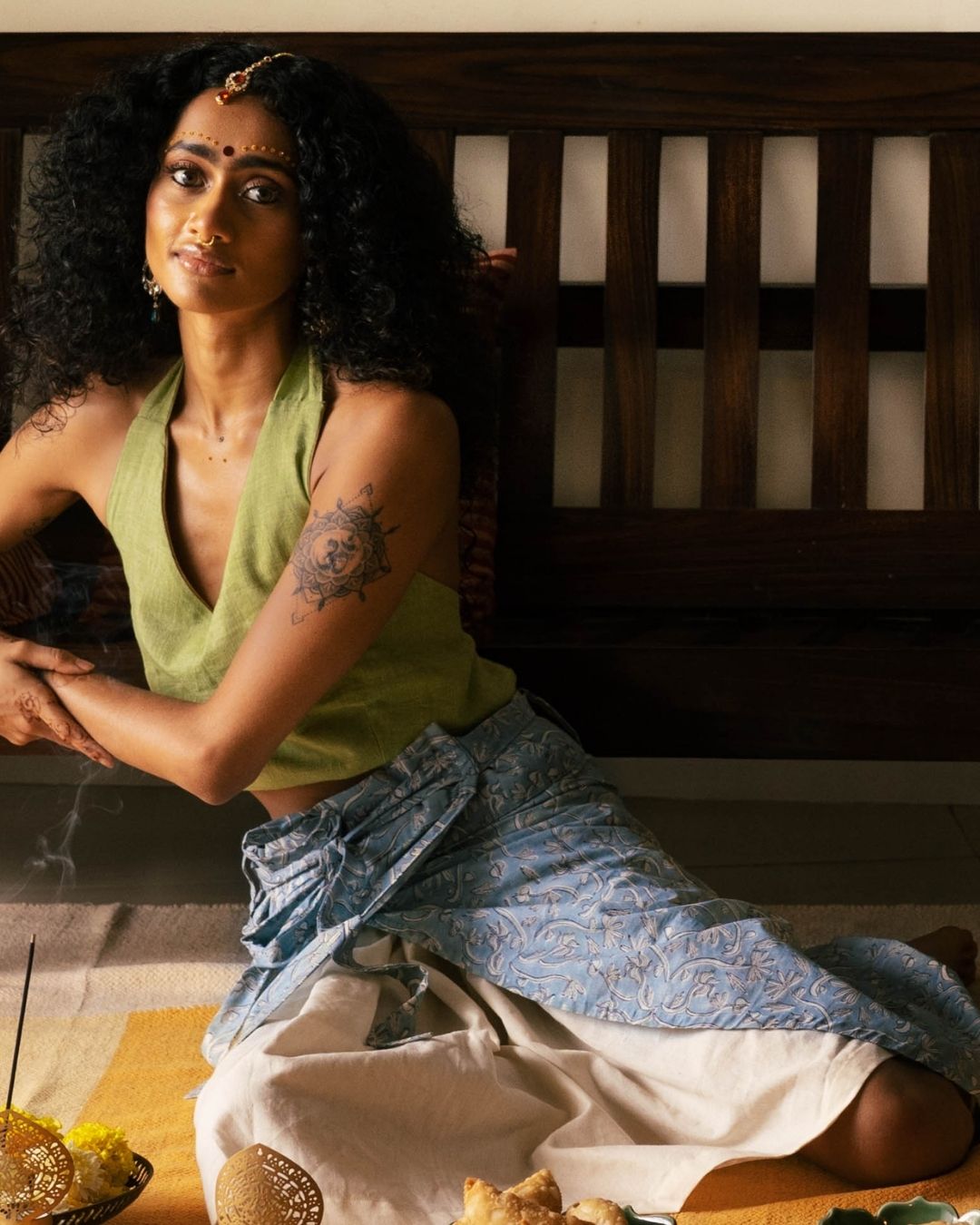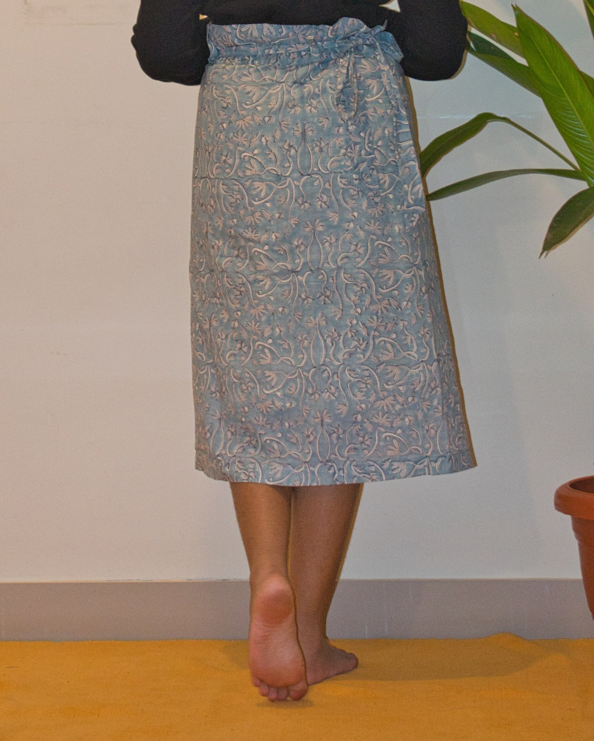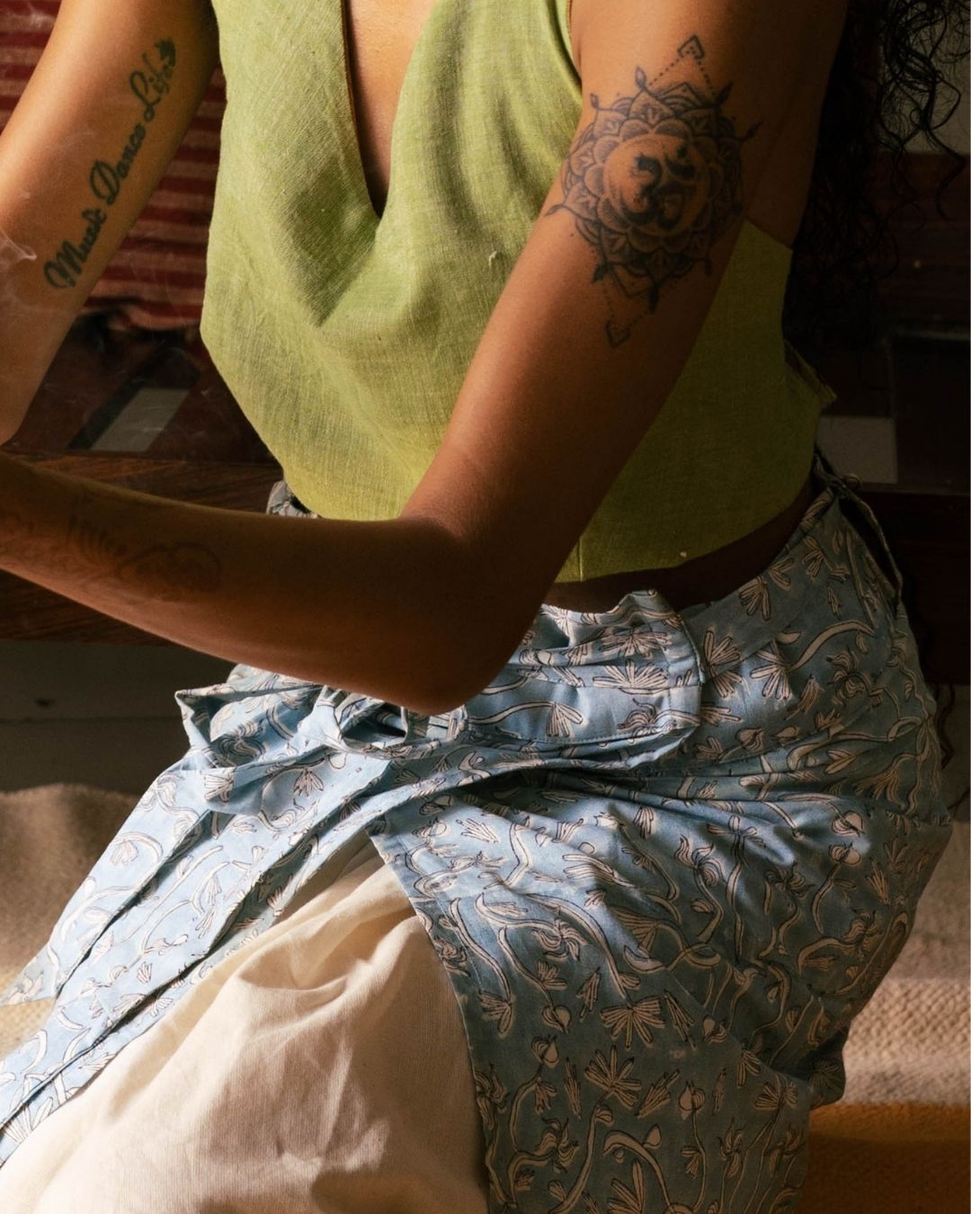 Pudina chutney skirt set - nothing tastes better than mint chutney in our sandwiches! Here we are with a kind of sandwich of our own ;P. Handcrafted with block-printed mull and off-white handwoven ikkat fabric. This set consists of an off-white gathered skirt that hits right at your knee and a mint block printed mull wrap skirt. Flaunt it together or wear it as separates, get creative and tag us to show off your versatile styling skills!