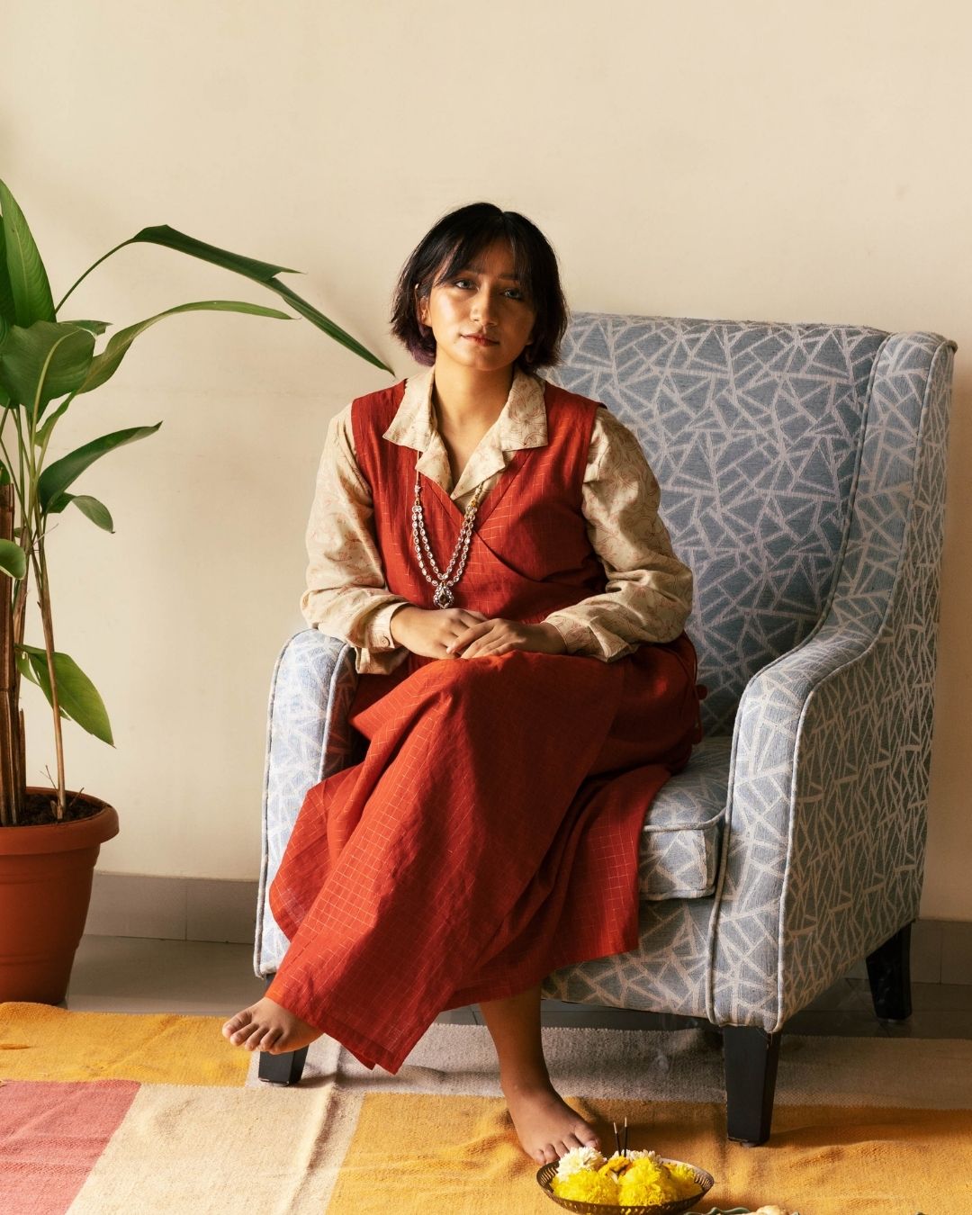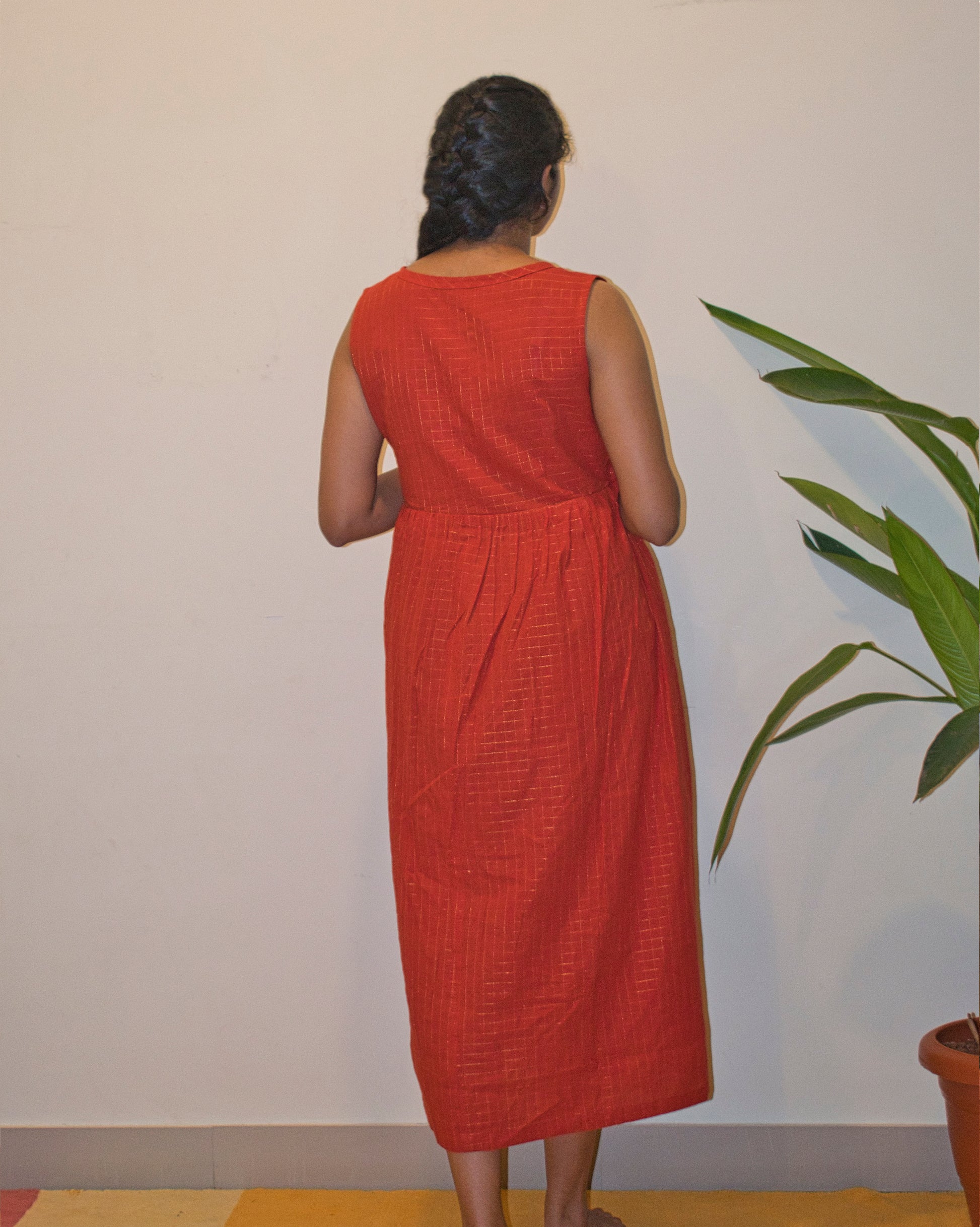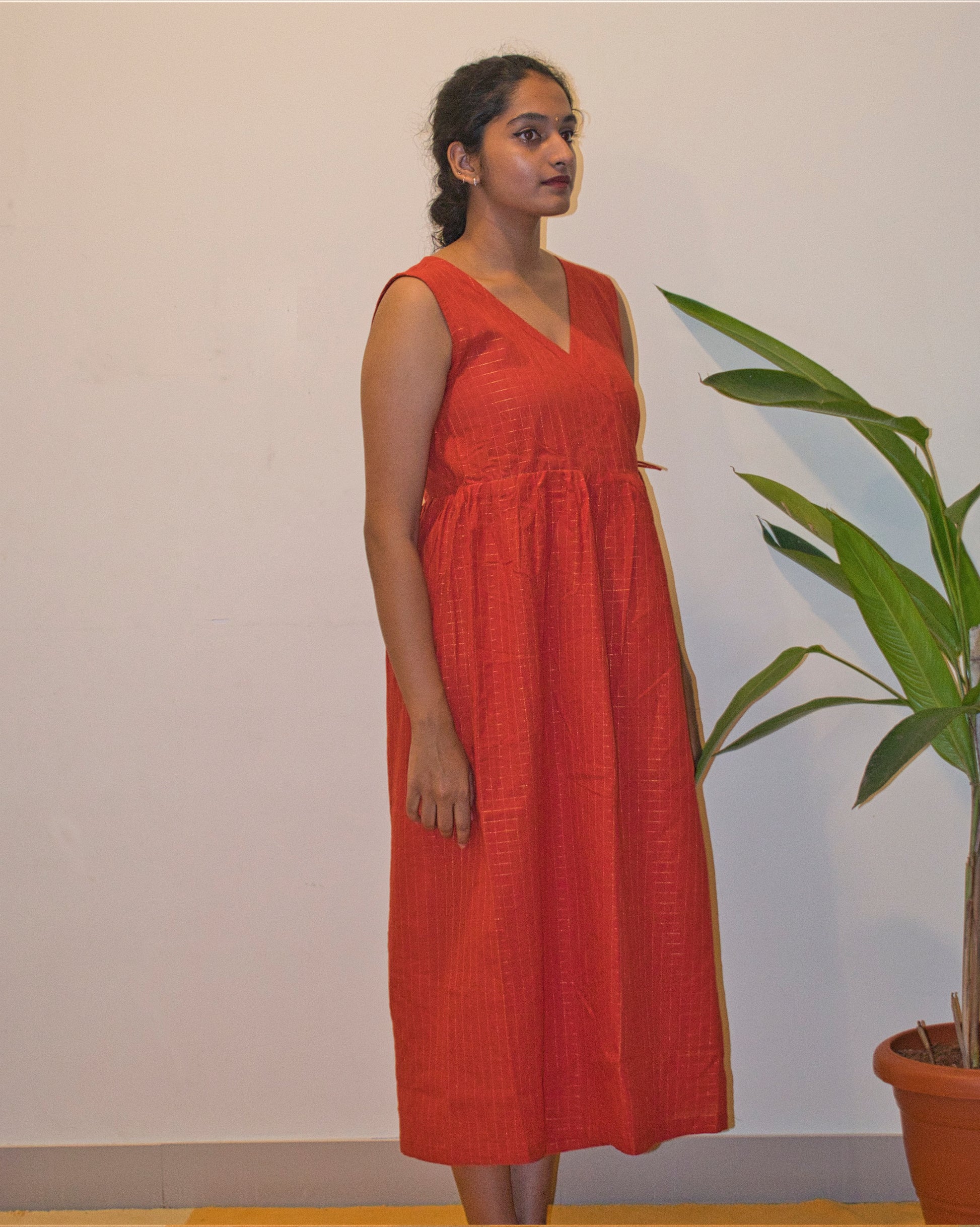 This bright wrap dress is made from azo-free dyed handwoven zari mul. The deep V and subtle flair in this bright red makes for a great layering piece. Wrap it or leave it open as a jacket. You might never find a more versatile red piece of clothing.