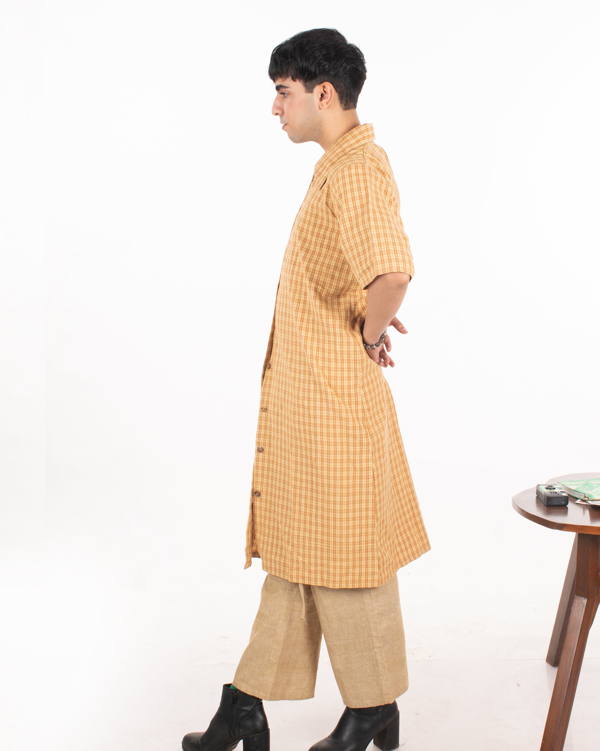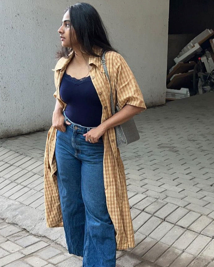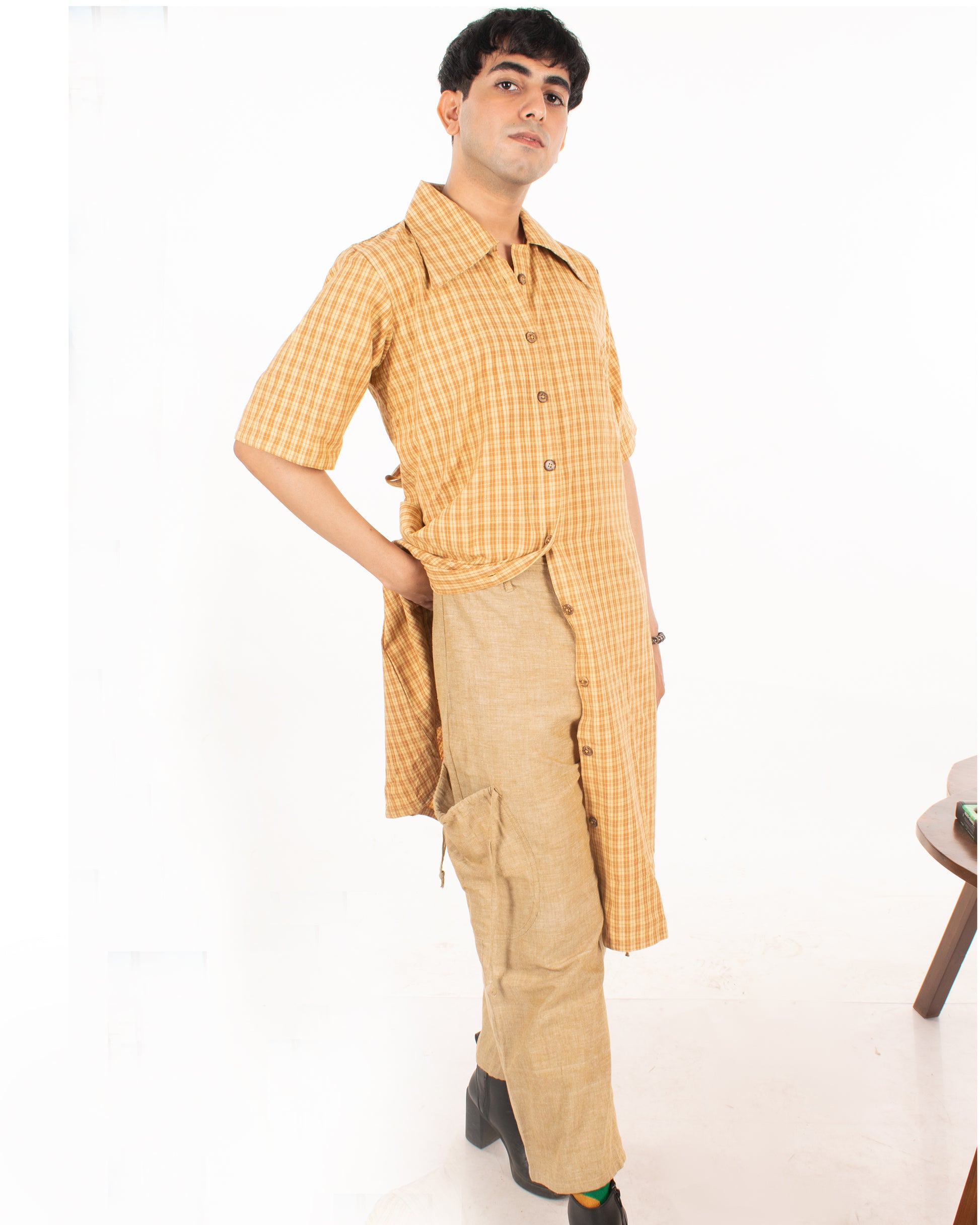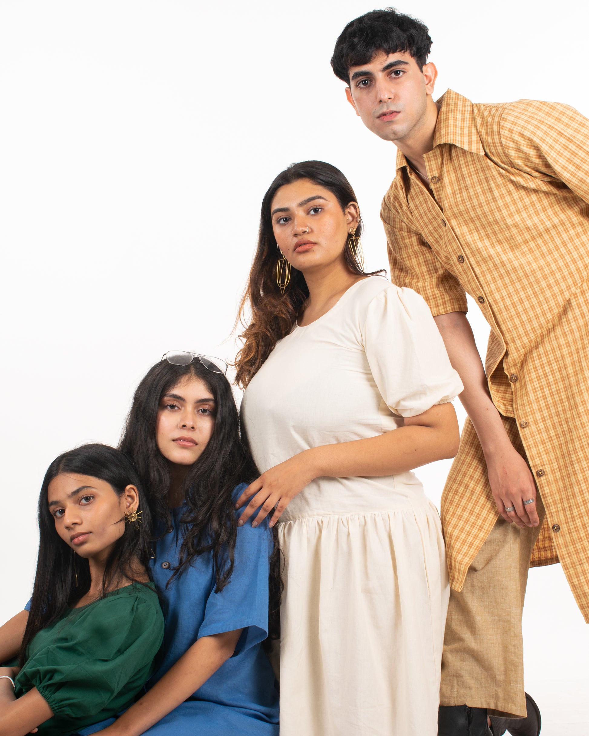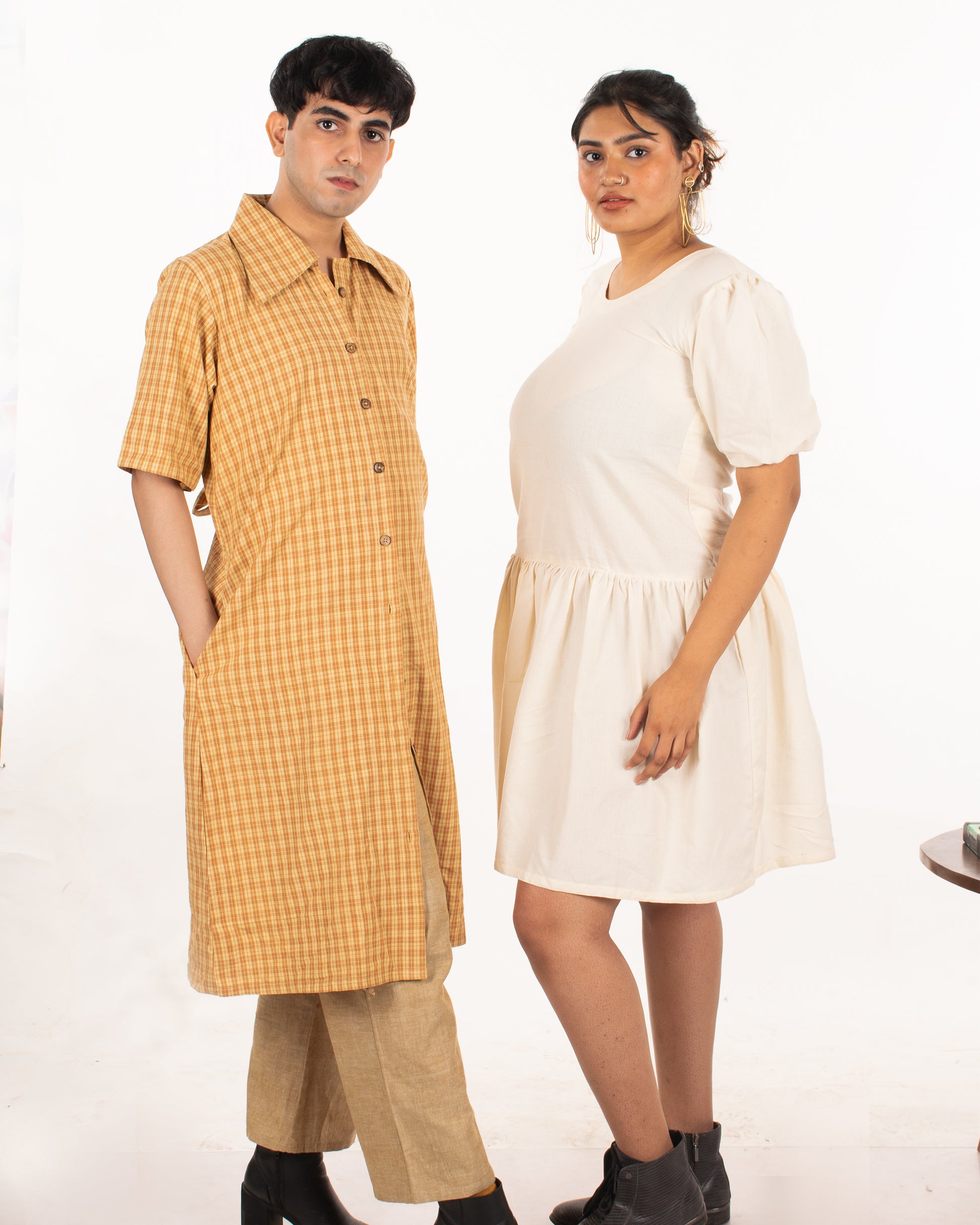 Calf-length dress/cover-up in cotton with a shirt collar and coconut buttons all the way down the front. Wear it as a coverup or style it as a dress. To adjust the fit use the tie-up detail at the back. An ideal length for the sultry summers with an anti-fit body and 3/4th sleeves. Upcycled from export surplus fabric contributing to the circular economy.