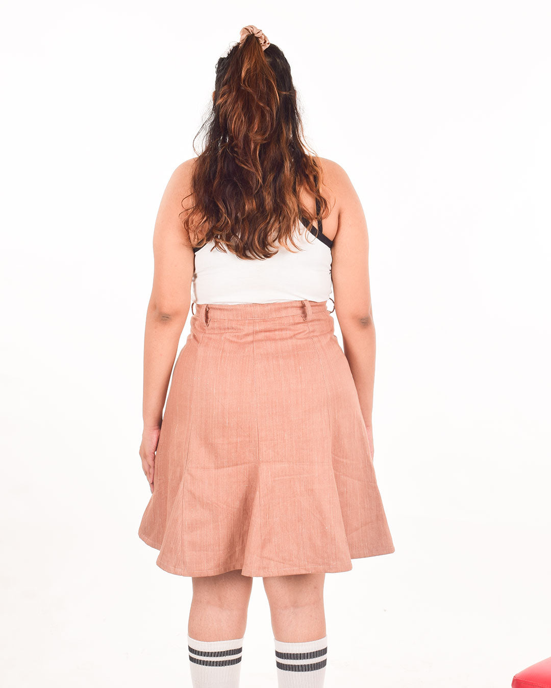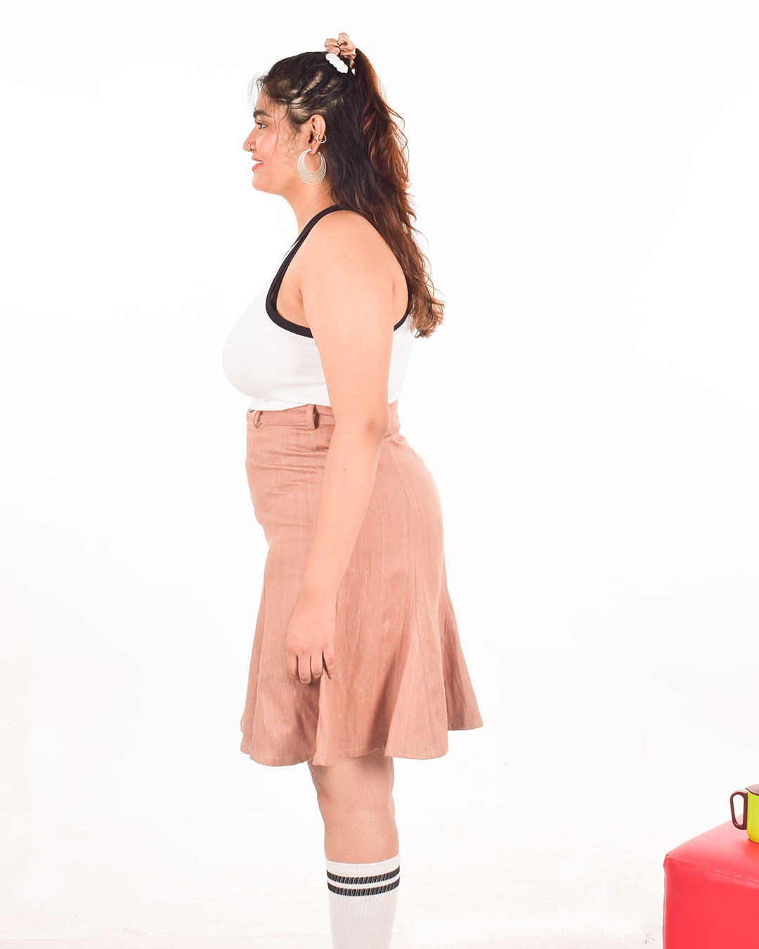 Twirl and turn heads all day long in this skirt. This is a perfect day-to-night staple, in the neutral shade of brown, which can be easily paired with and still look unique in a crowd. Made with brown khaadi denim with gazettes to give that extra oomph. Upcycled by leftover khaadi denim at khaadi Bhandar, Gujarat.