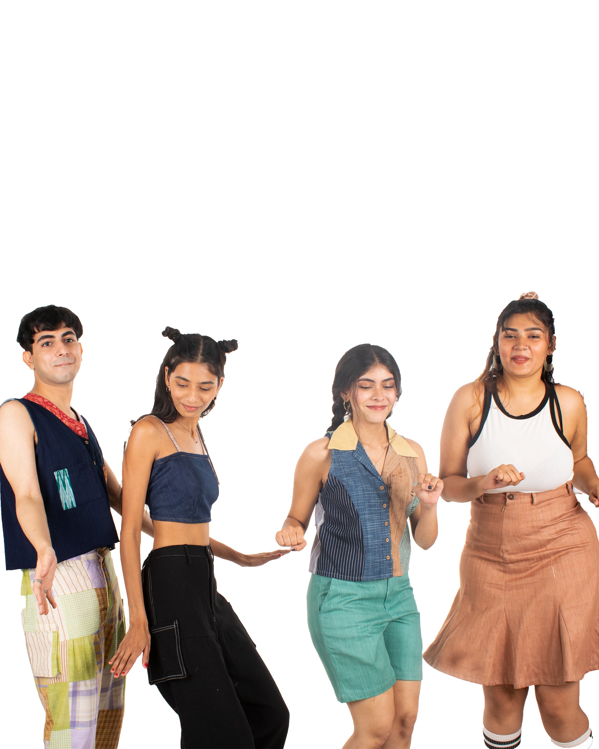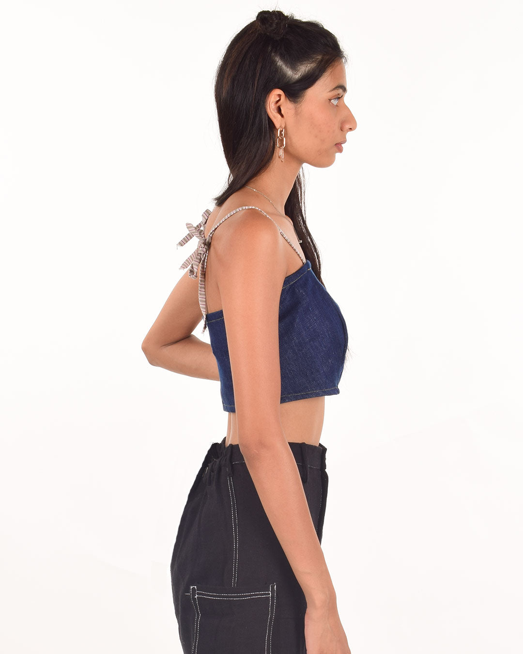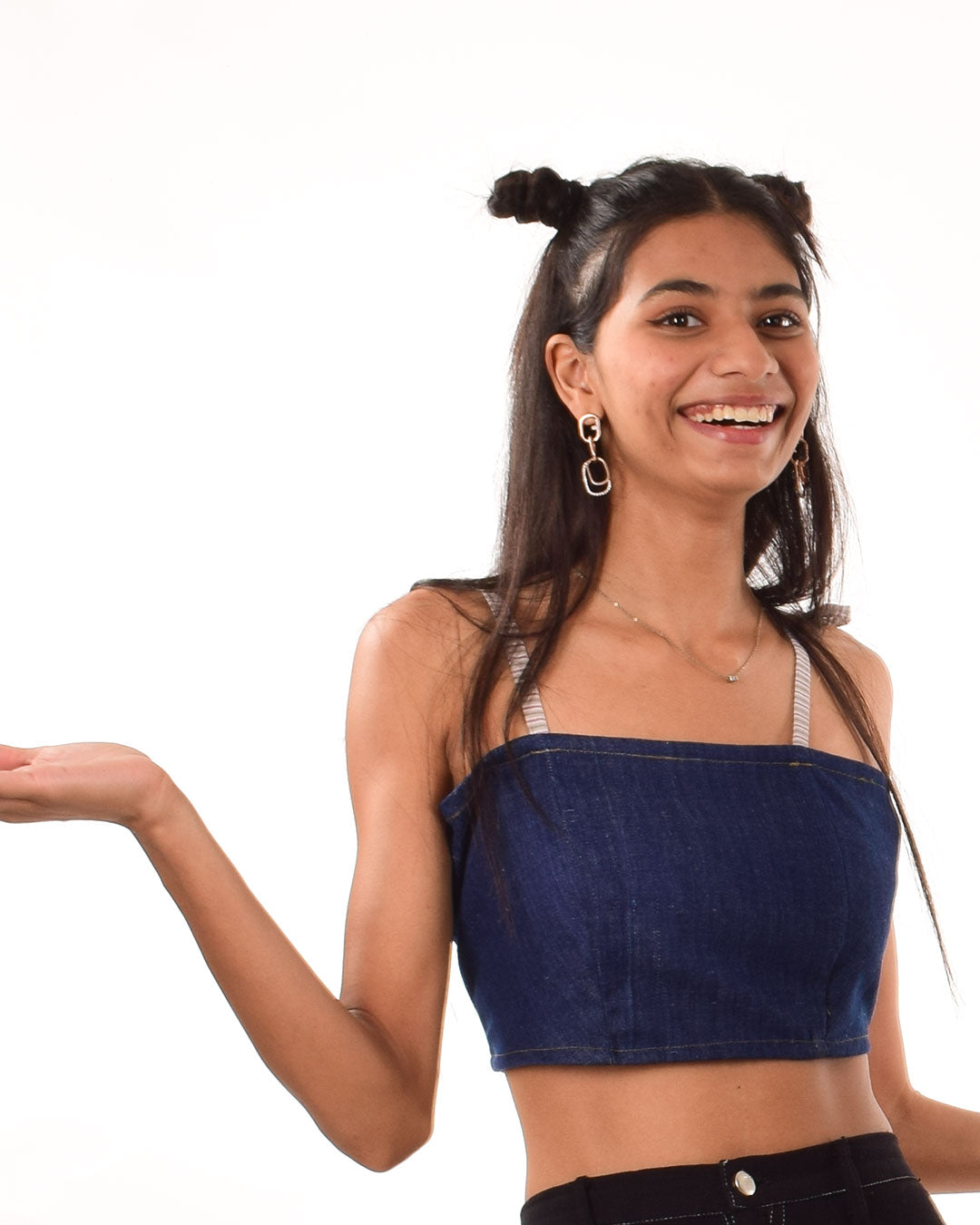 Crop top in cotton khaadi denim with a square neckline, shoulder straps made with contrast chindis, and a zip at the side. Layer it with a printed shirt or pair it with a skirt / high-waisted trousers for a simple look. Upcycled by leftover khaadi denim at khaadi Bhandar, Gujarat.