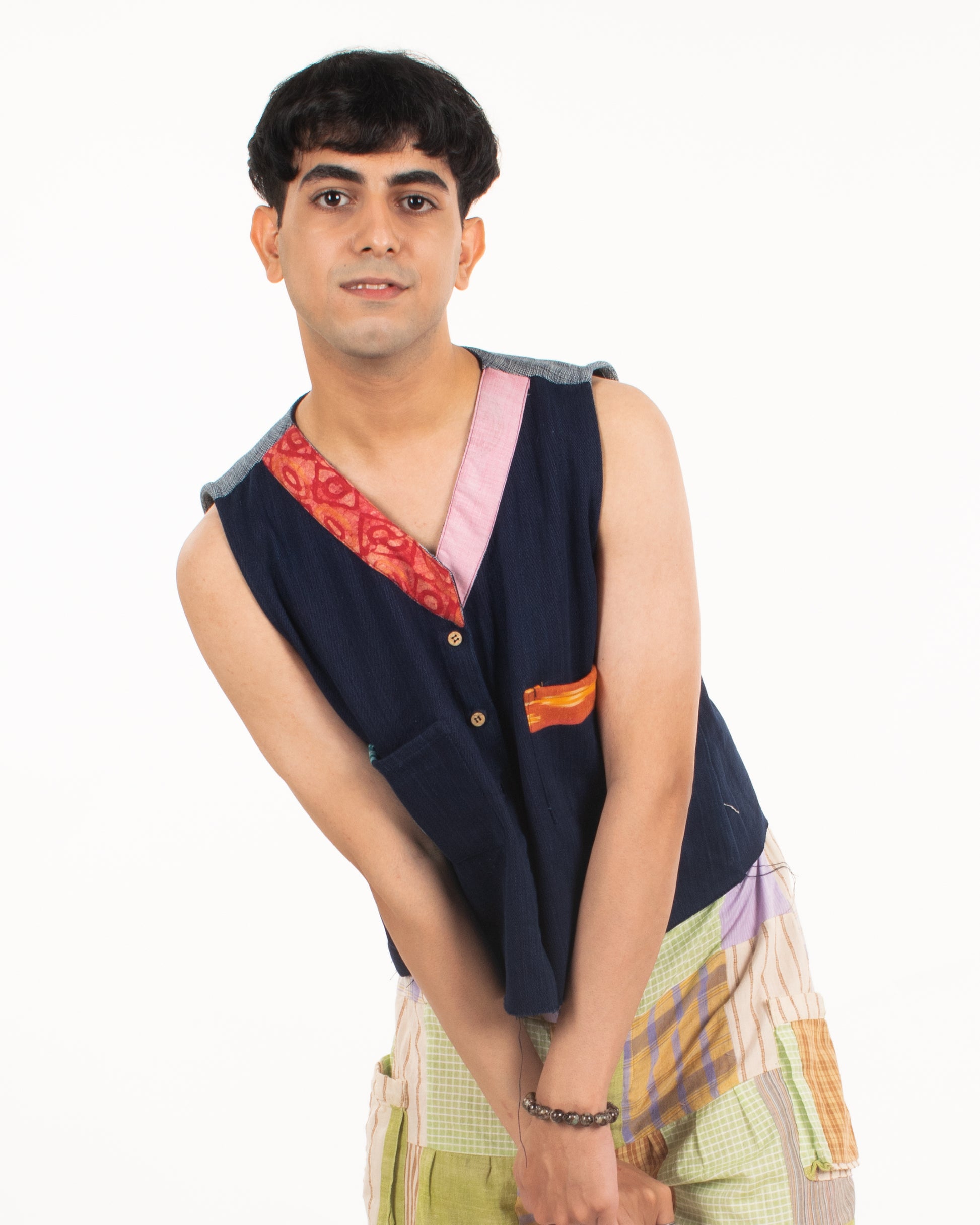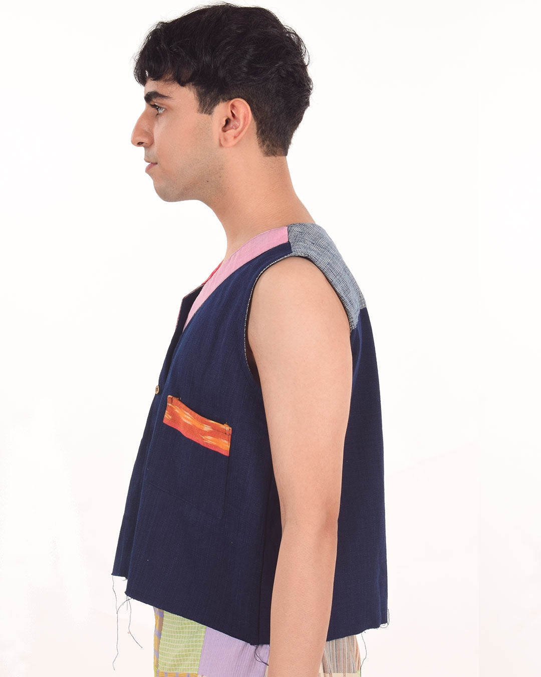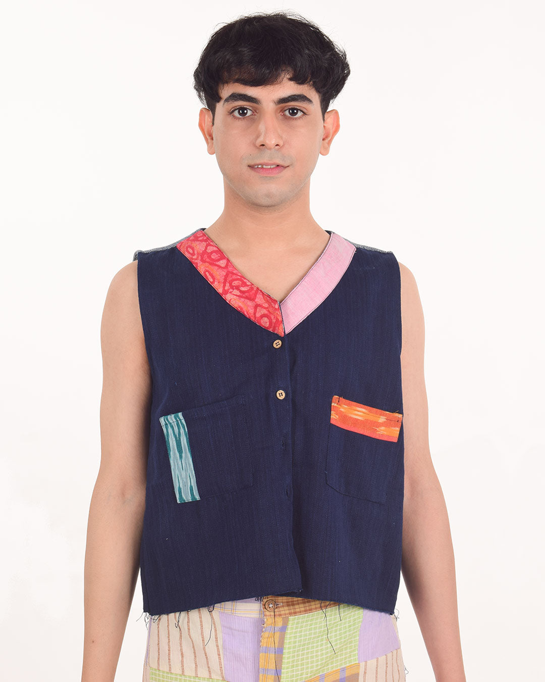 Radiating classic versatile vibes, this sleeveless button-down denim jacket with 2 pockets and contrasting chindi fabric detailing on the collar, back yoke, and pockets offer a great fit and uniqueness to your wardrobe. Upcycled by leftover khaadi denim at Khaadi Bhandar, Gujarat.