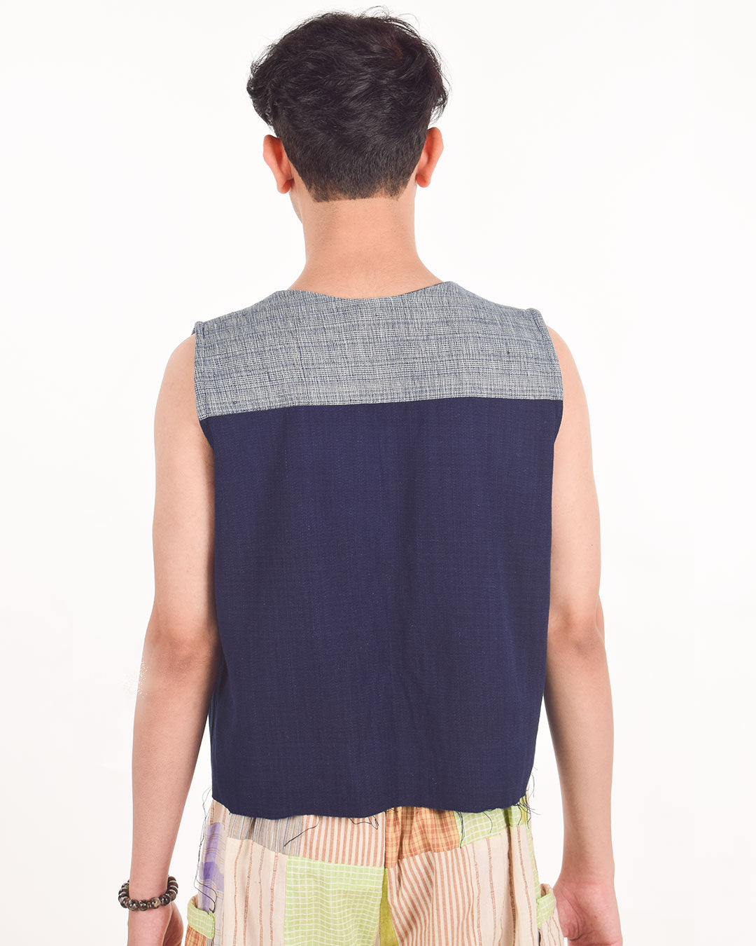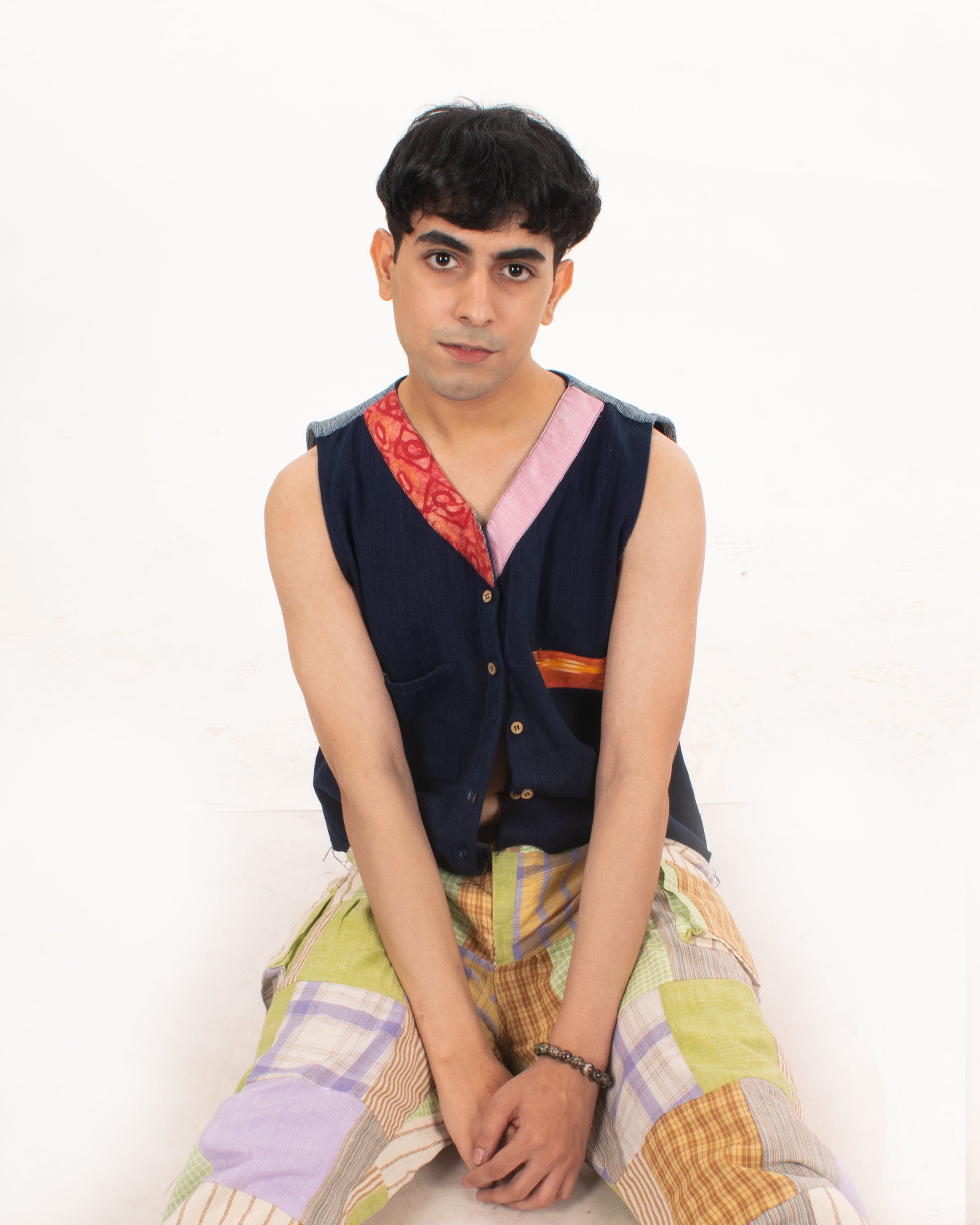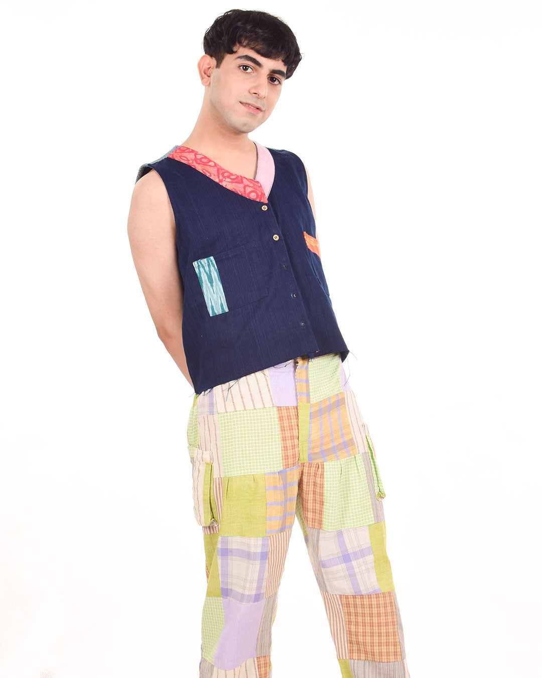 Radiating classic versatile vibes, this sleeveless button-down denim jacket with 2 pockets and contrasting chindi fabric detailing on the collar, back yoke, and pockets offer a great fit and uniqueness to your wardrobe. Upcycled by leftover khaadi denim at Khaadi Bhandar, Gujarat.