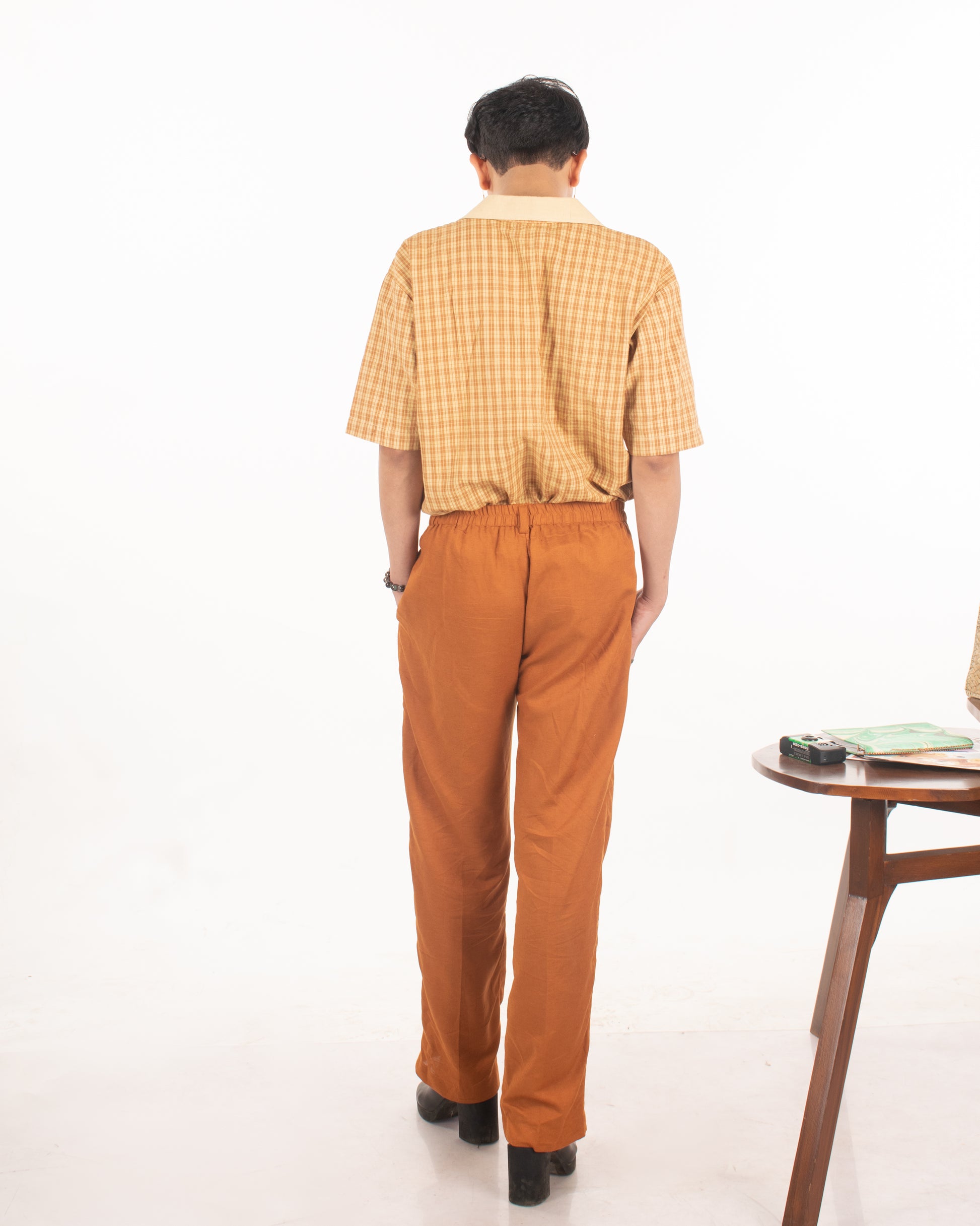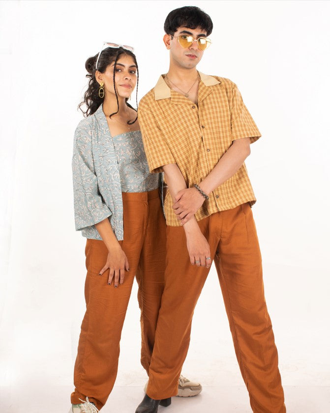High-waisted, front pleated straight-legged trousers that feature an elasticated waist making them ideal workwear. In the earthy shades of brown and dark green, that work with classic white shirts, graphic tees, or a simple short-printed kurta. Large pockets on the side for your phone, keys, and AirPods. Available in brown and green.